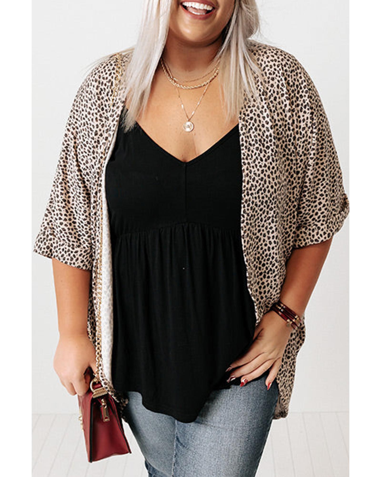 Khaki Plus Size Leopard Print Half Sleeve Open Front Cardigan – 2X
