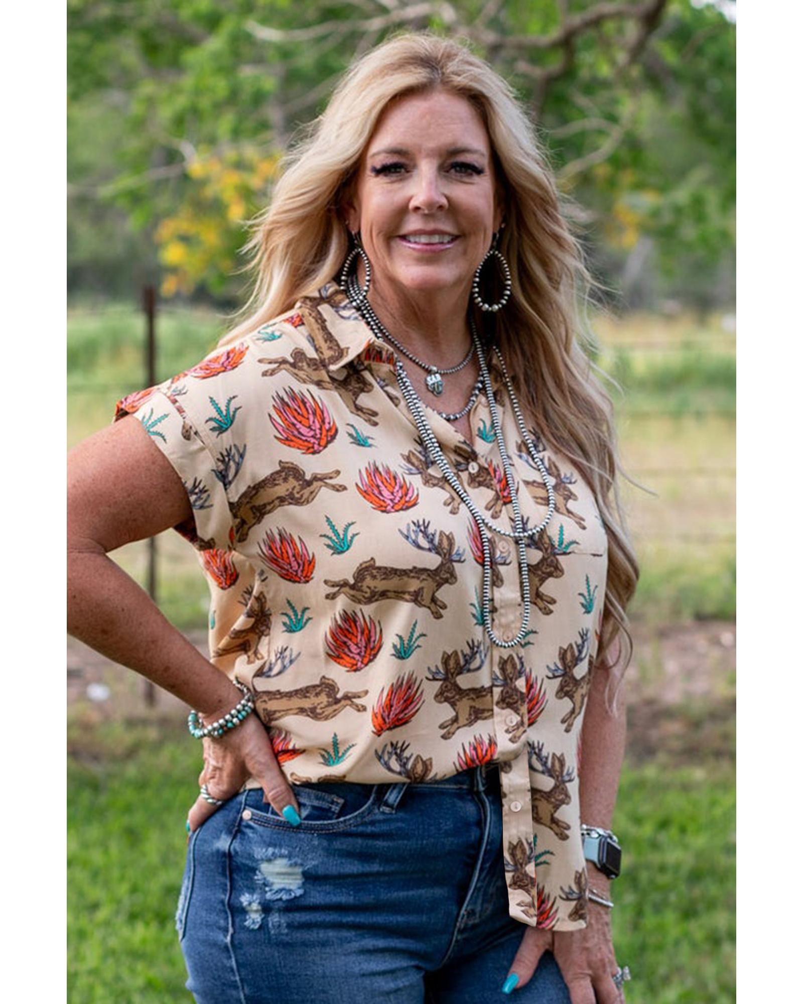Khaki Plus Size Western Pattern Print Buttoned Short Sleeve Shirt – 1X