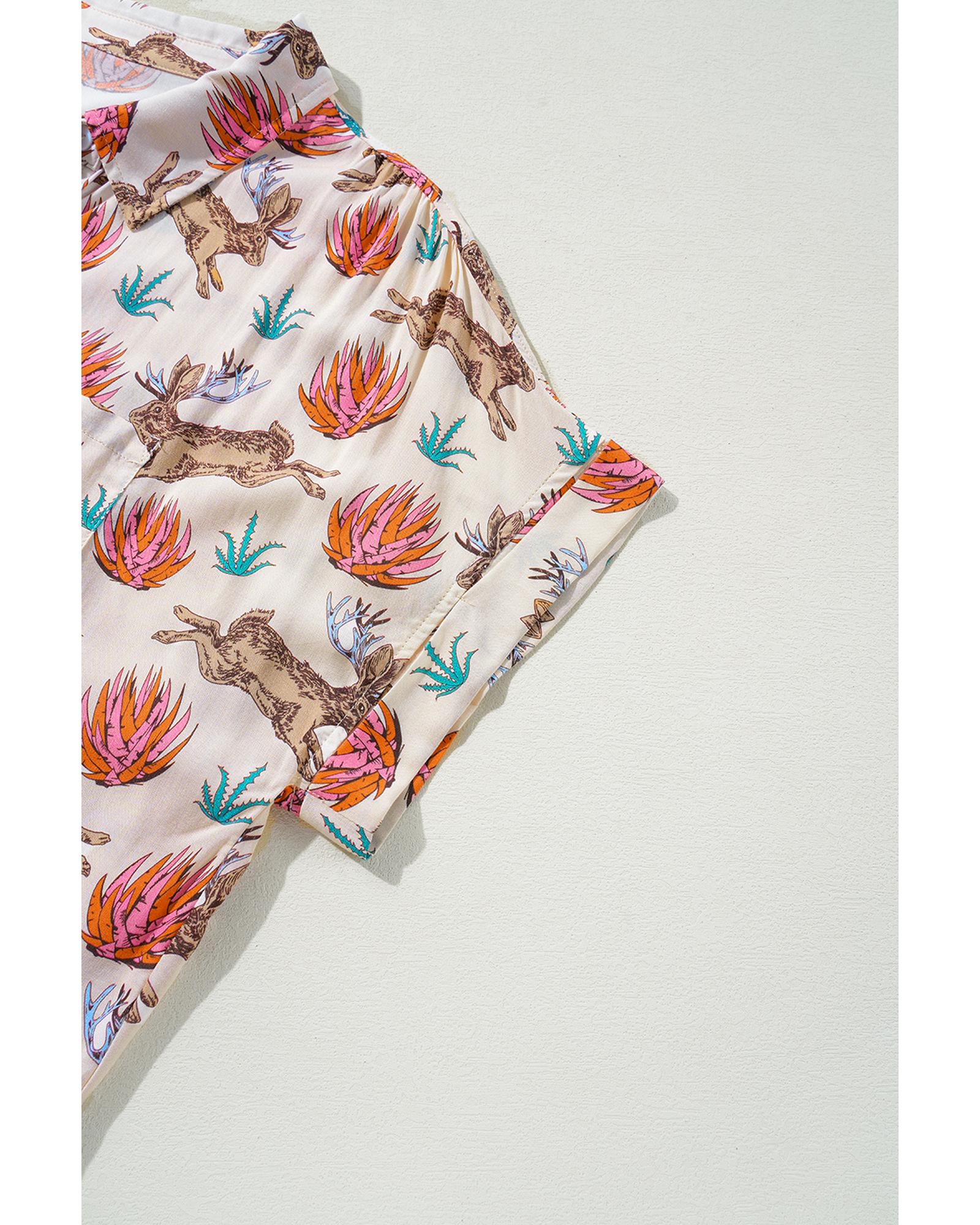 Khaki Plus Size Western Pattern Print Buttoned Short Sleeve Shirt – 4X