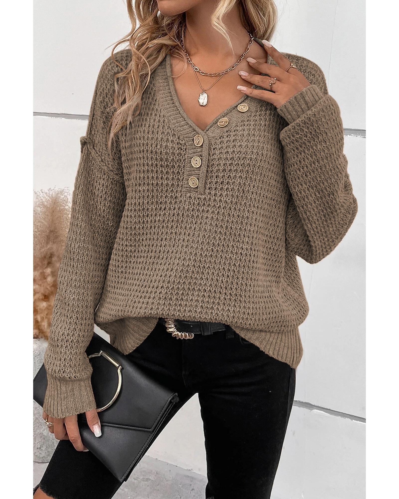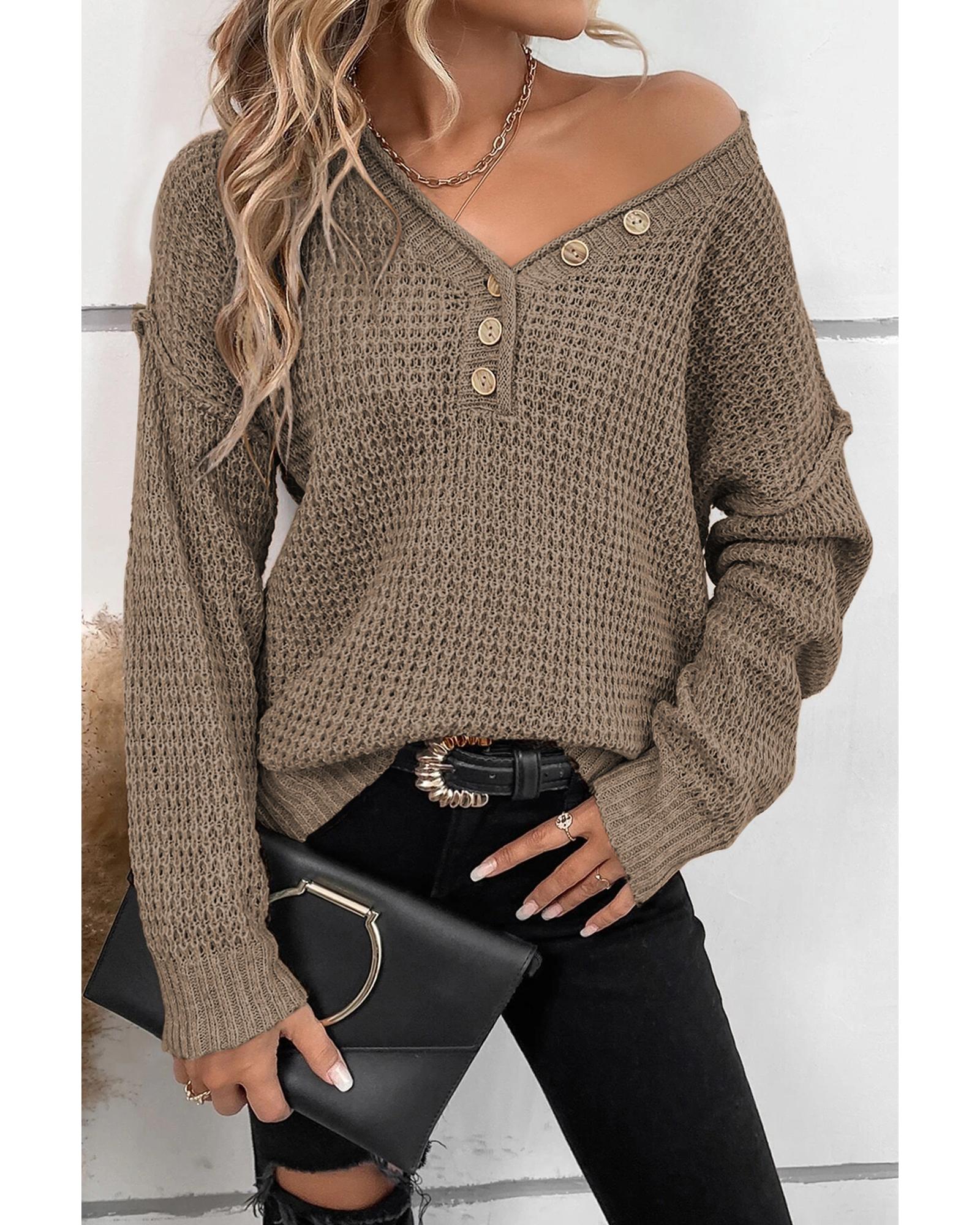 Khaki Pointelle Knit Button V Neck Drop Shoulder Sweater – L