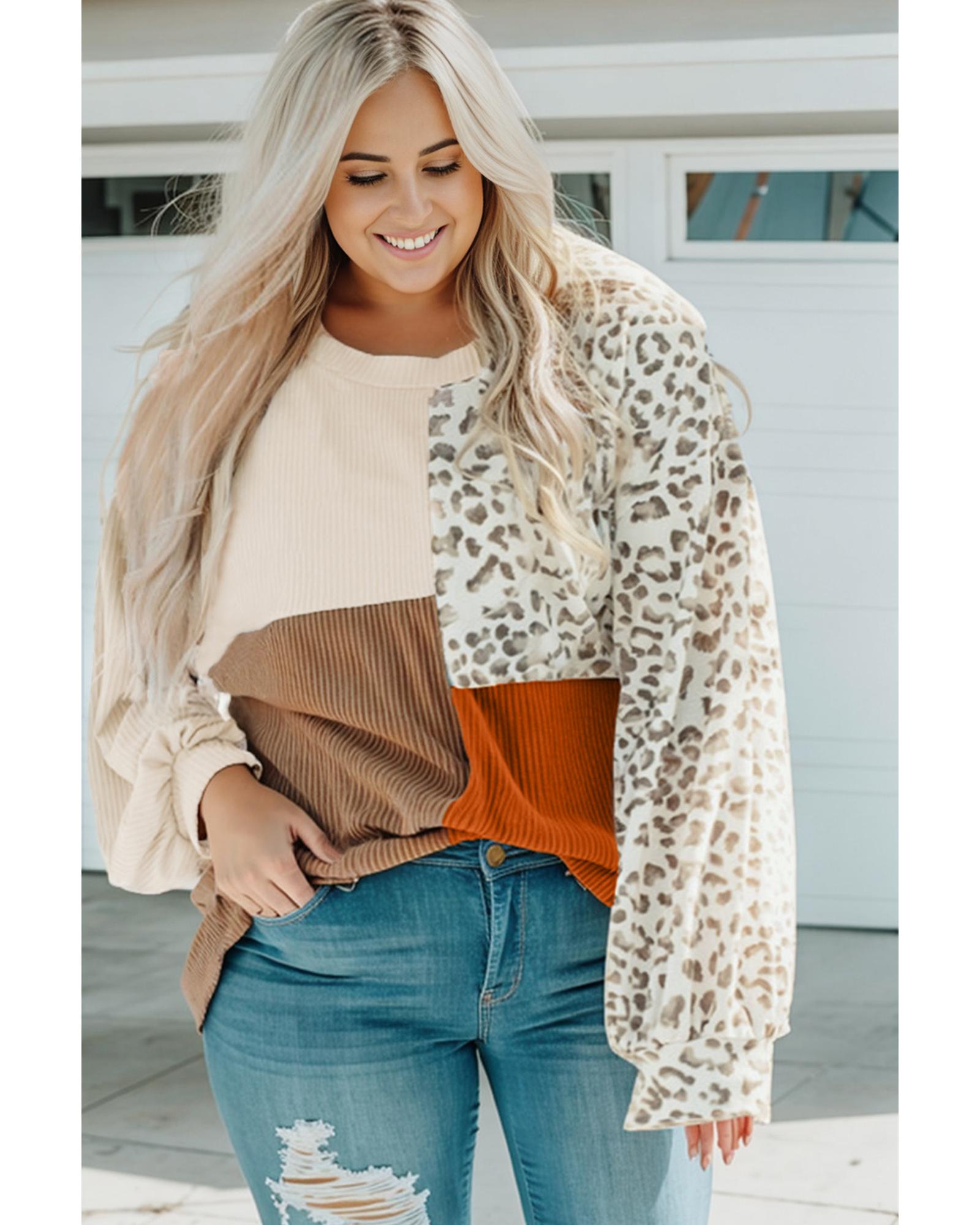 Khaki Ribbed Color Block Leopard Splicing Plus Size Top - 1X Original price was: $62.99.Current price is: $33.99.