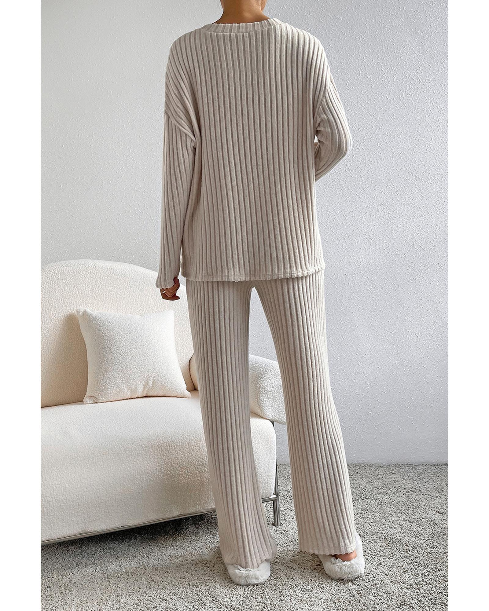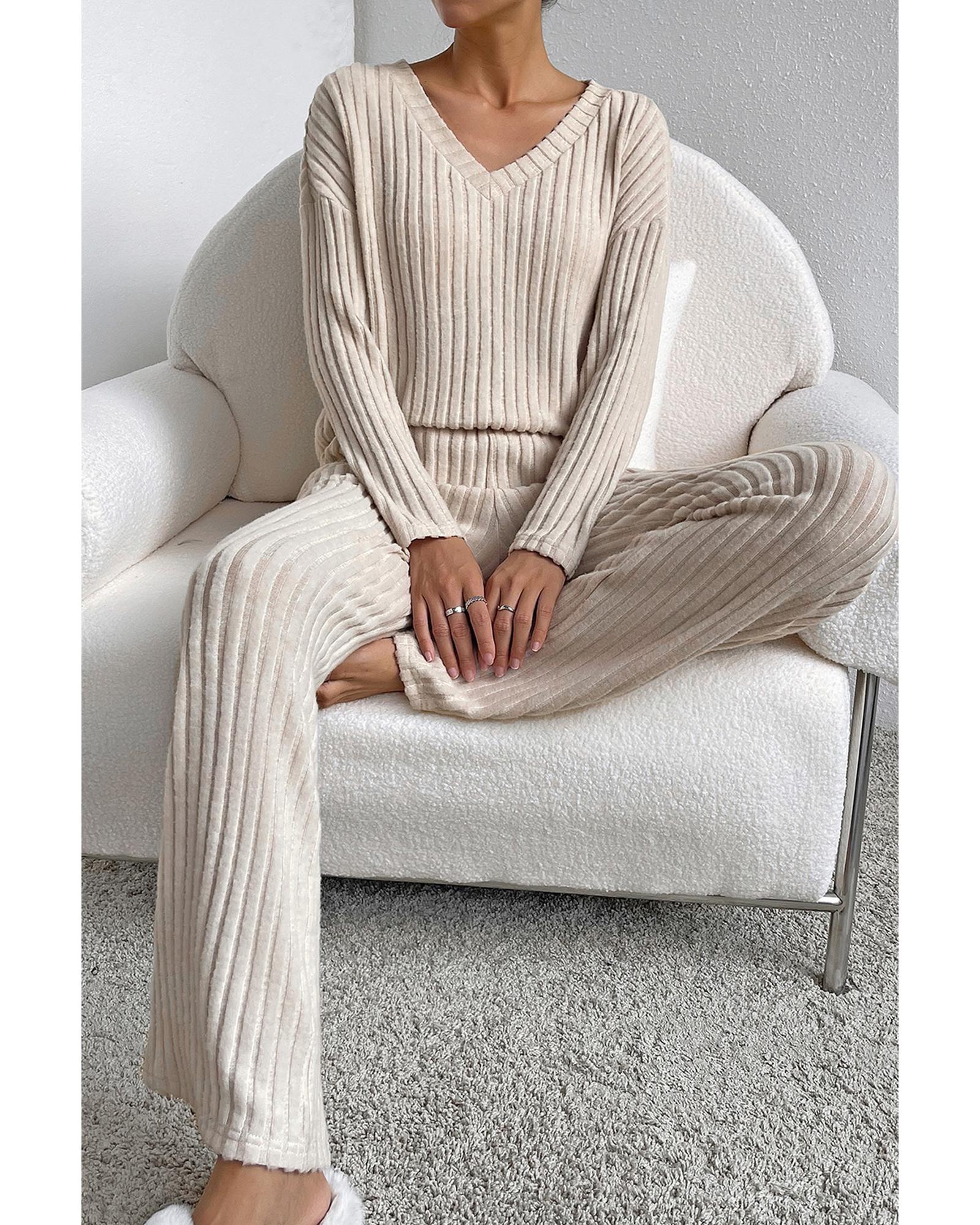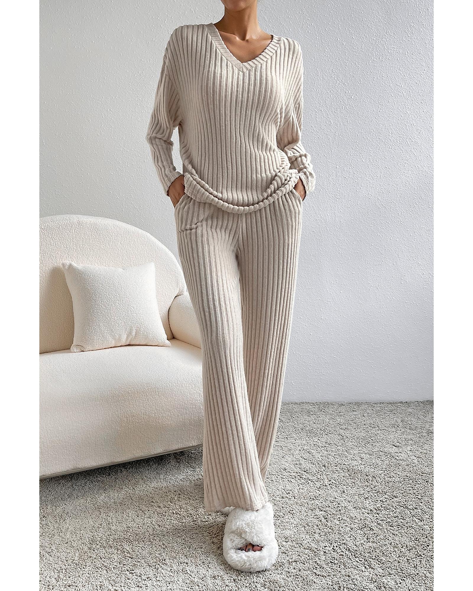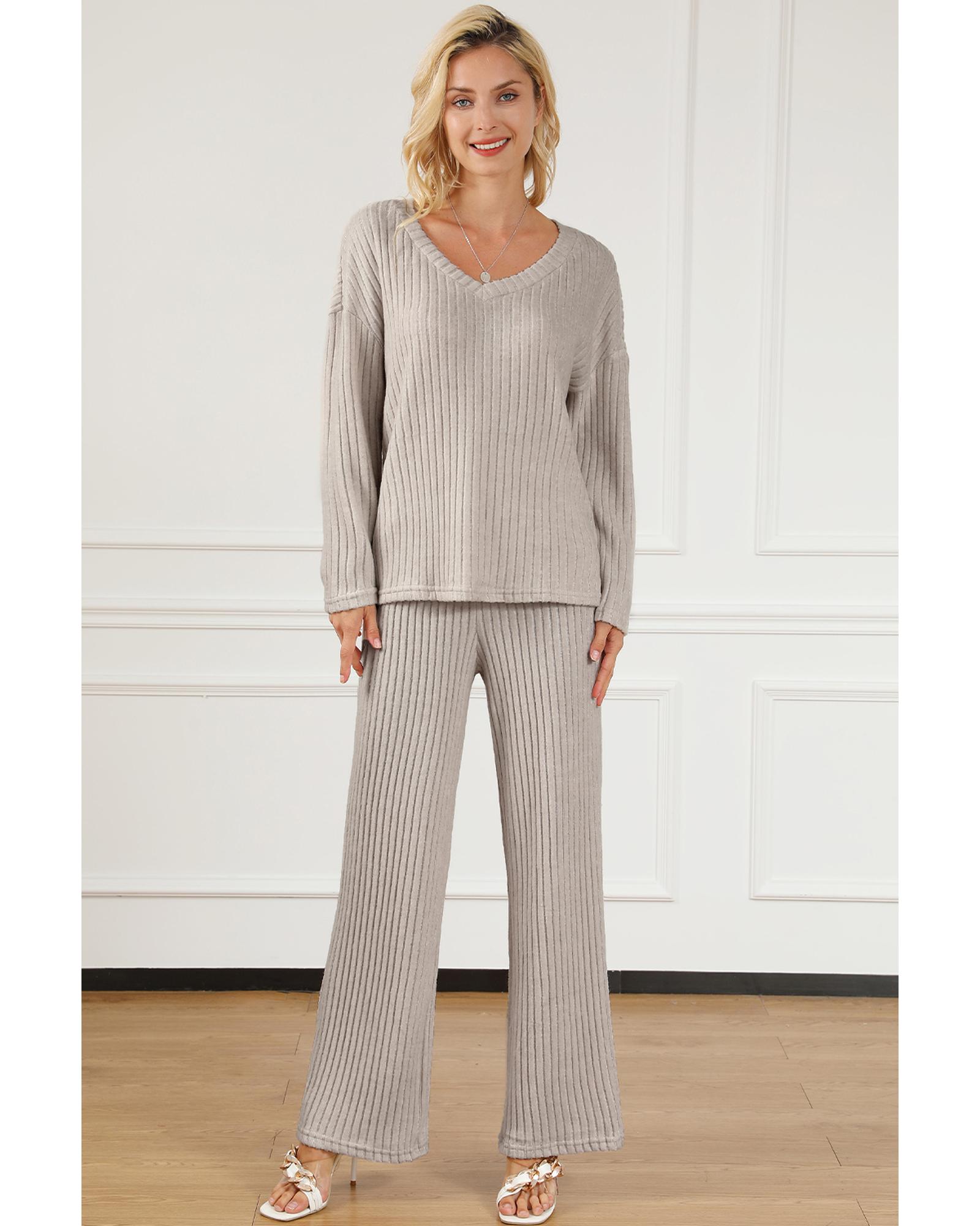 Khaki Ribbed Knit V Neck Slouchy Two-piece Outfit – S