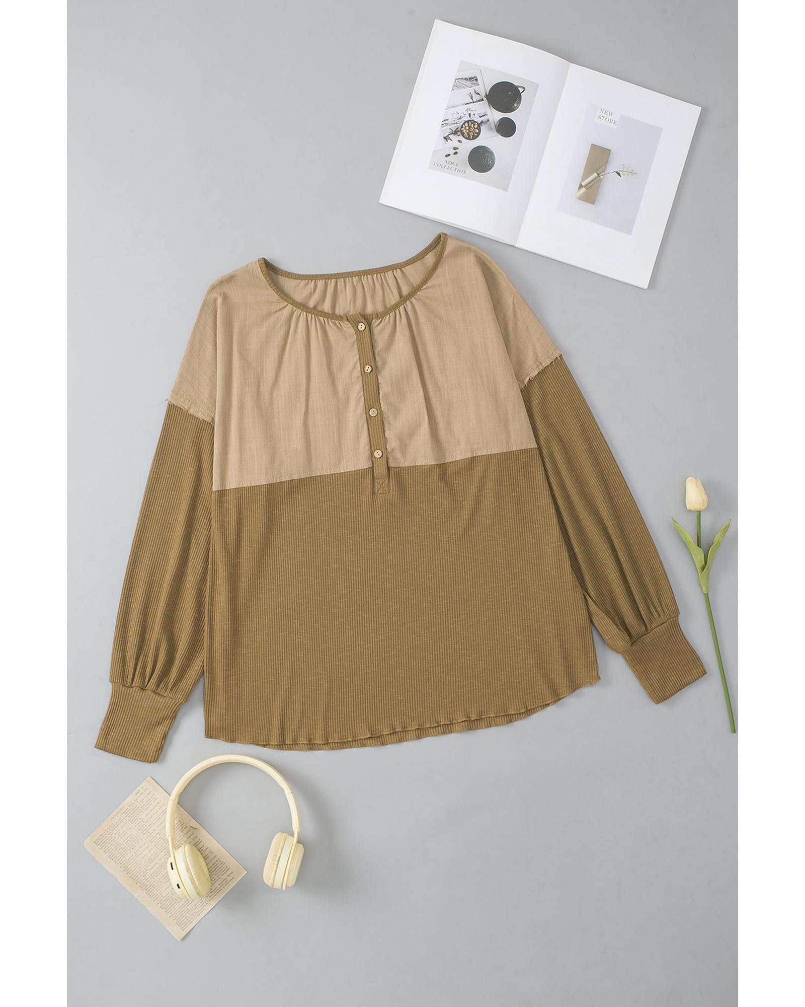 Khaki Ribbed Patchwork Drop Shoulder Buttoned Neckline Blouse – S