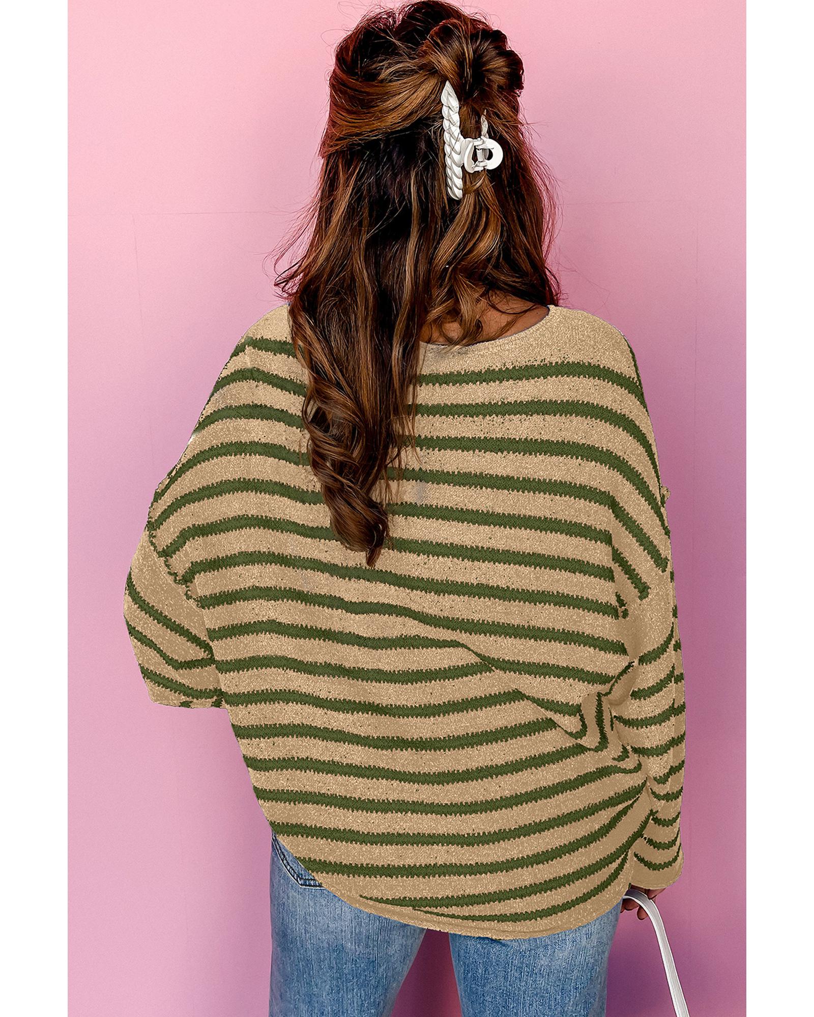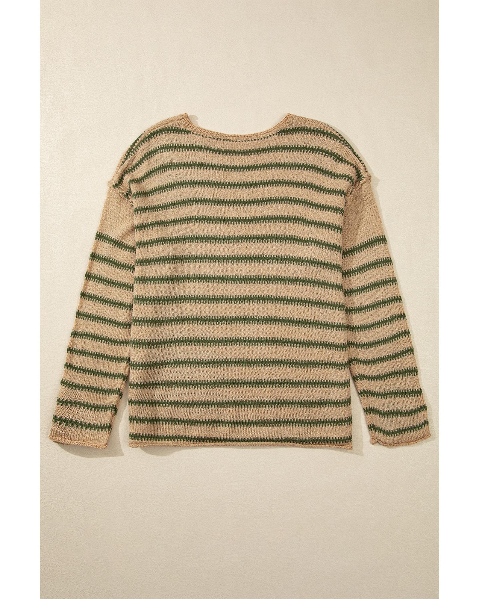 Khaki Stripe Drop Shoulder Casual Sweater – S