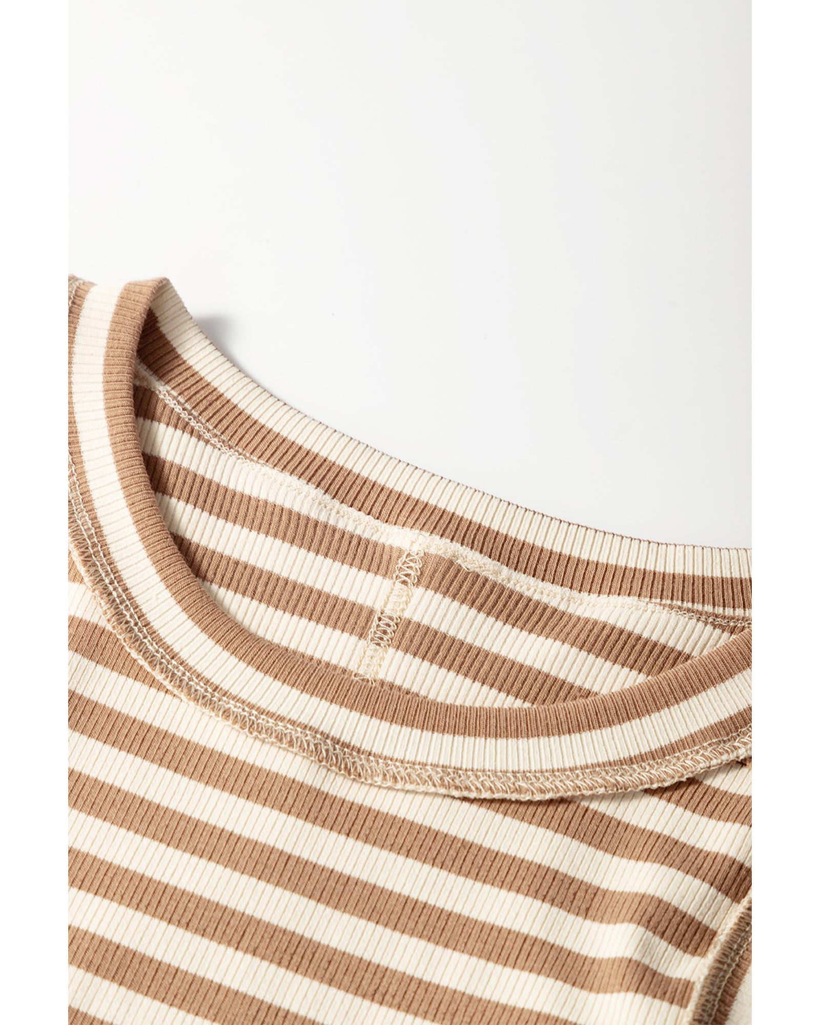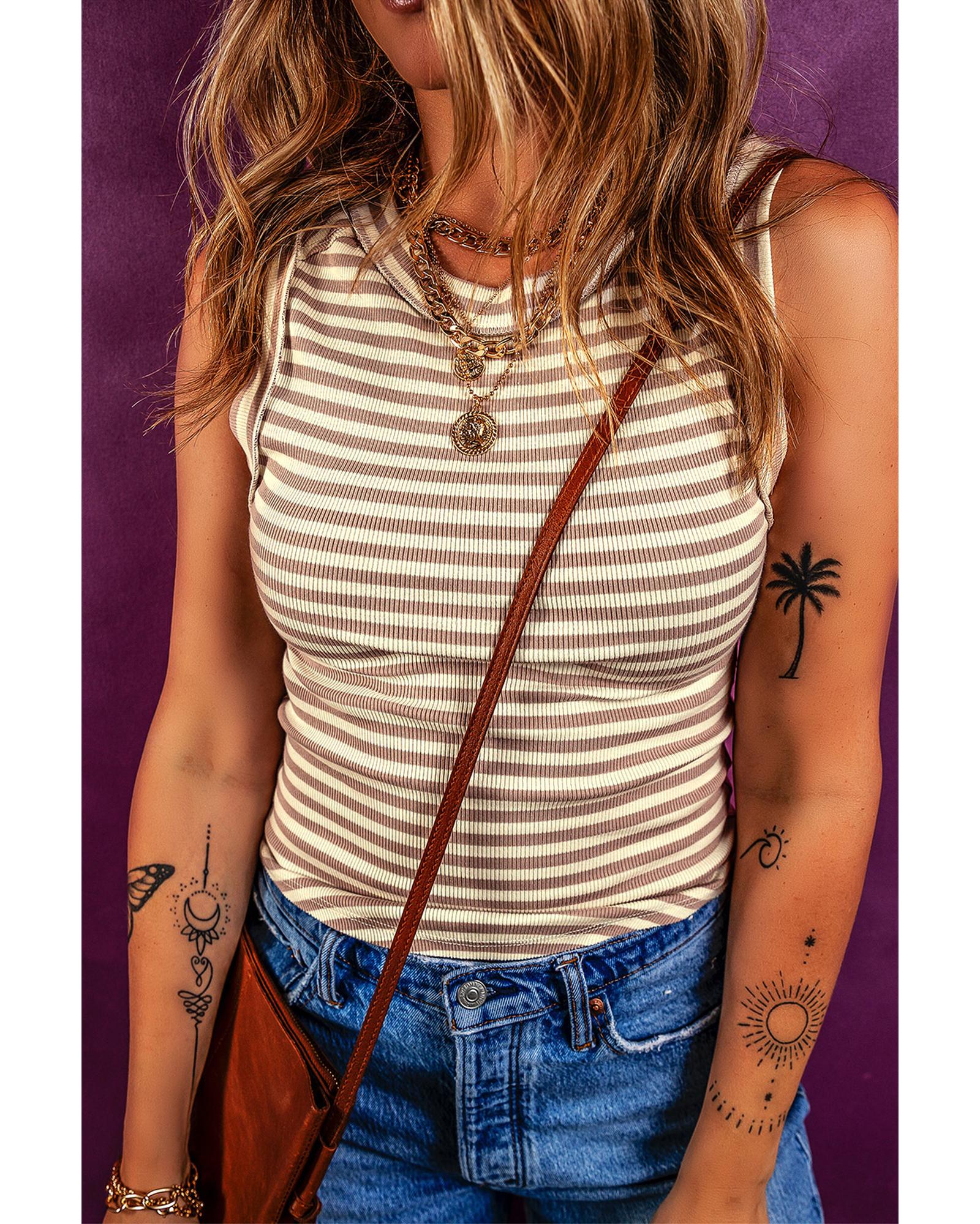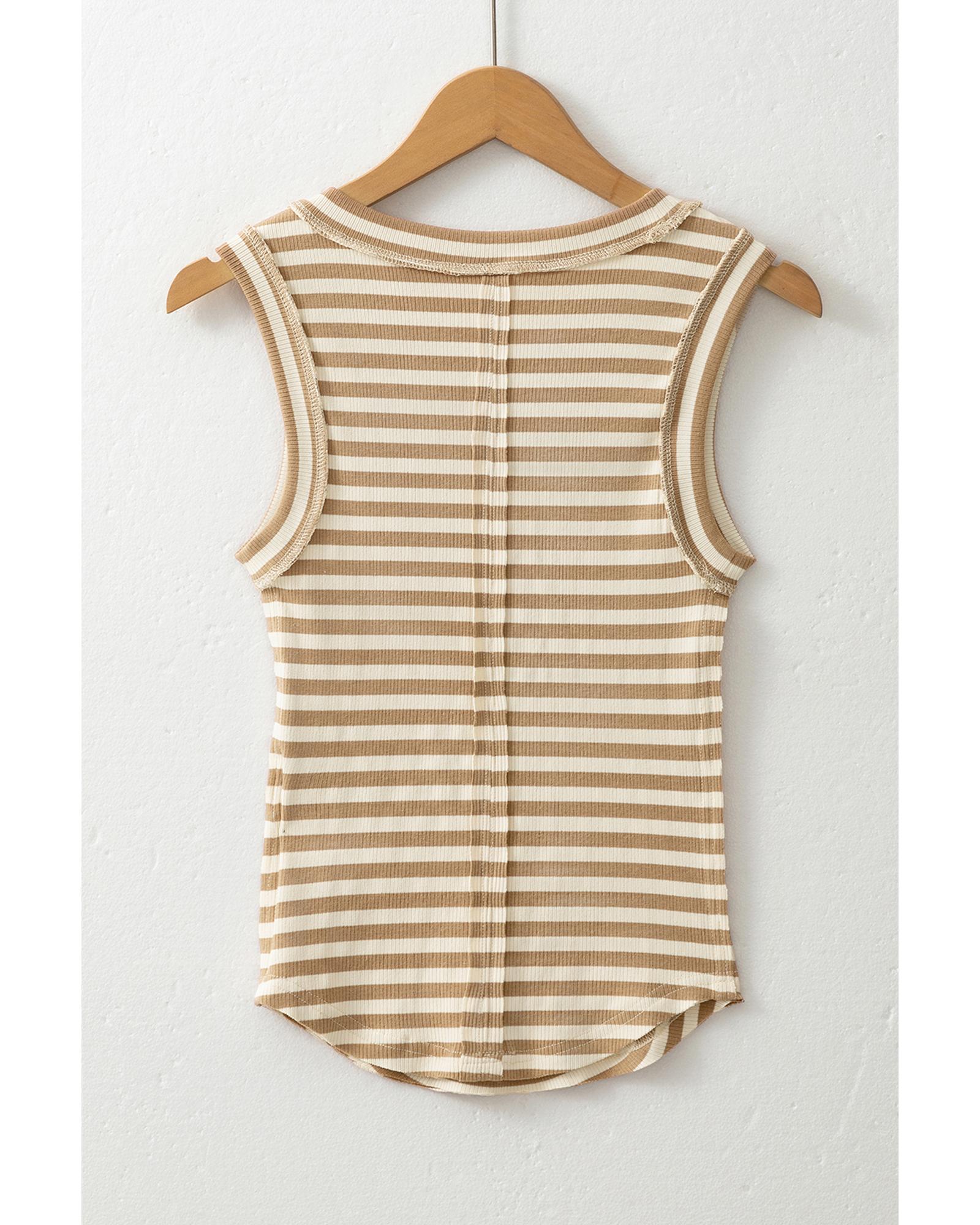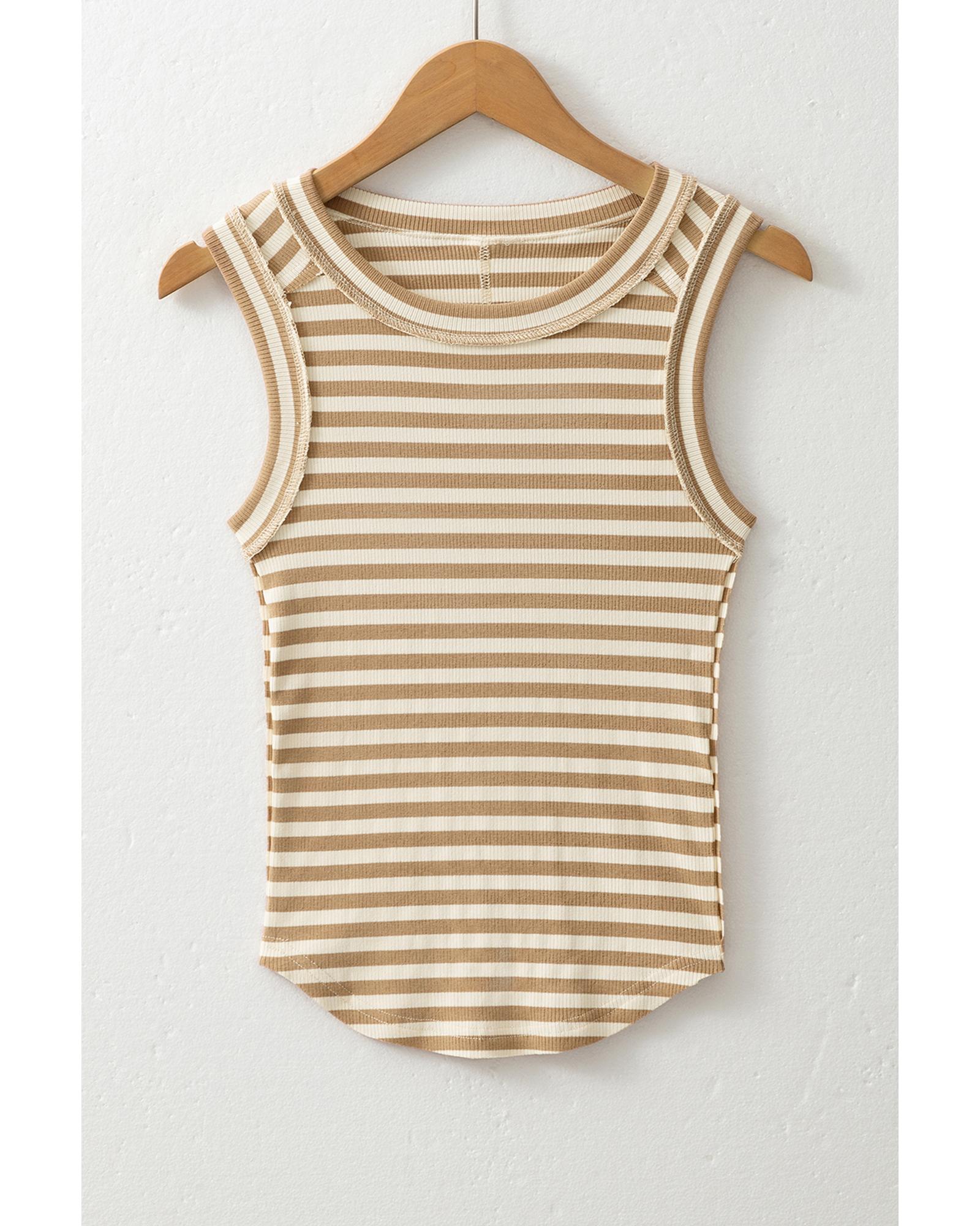 Khaki Stripe Exposed Seam Trim Round Neck Sleeveless Top – XL