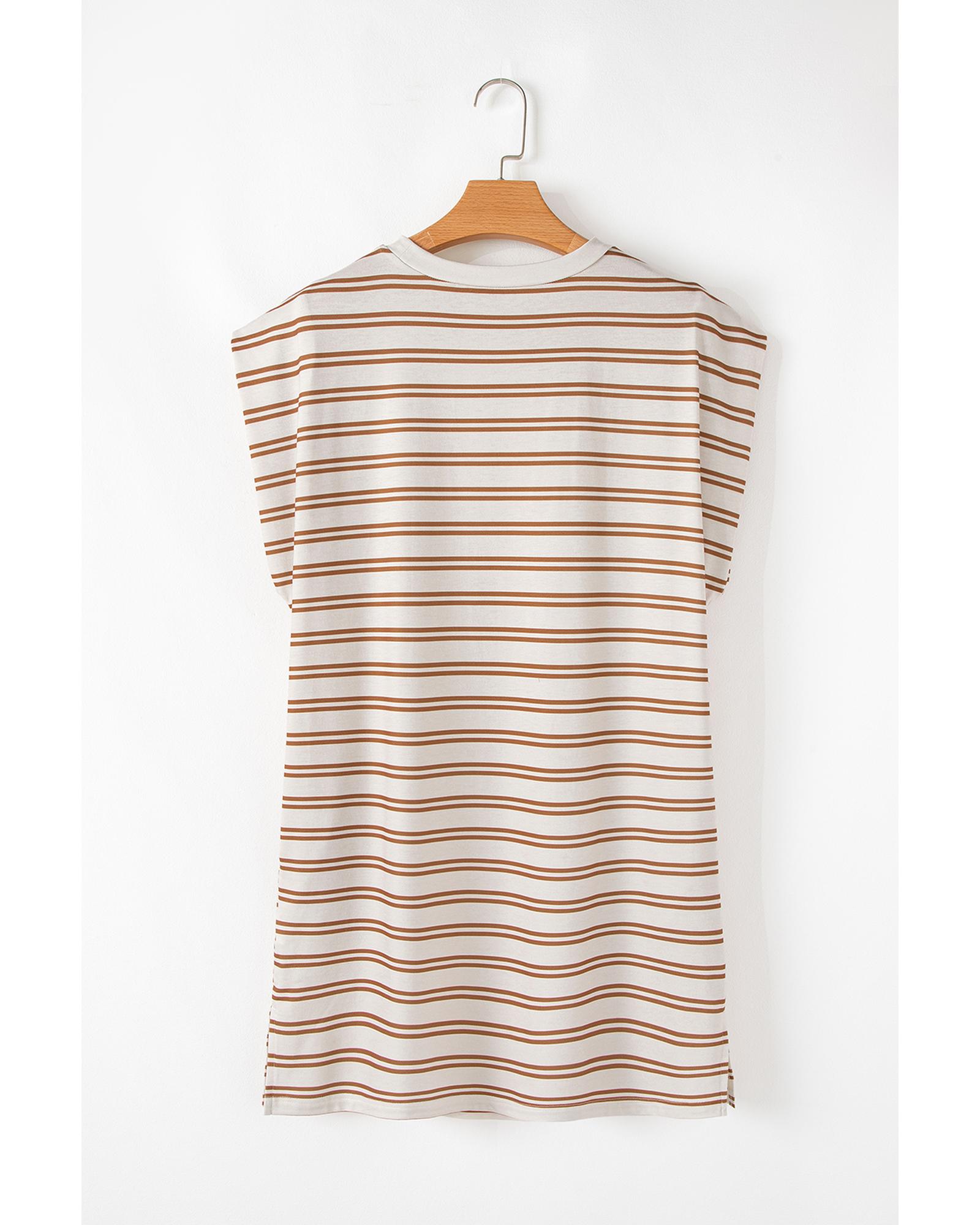 Khaki Stripe Round Neck Sleeveless Casual Pocketed Mini Dress – S
