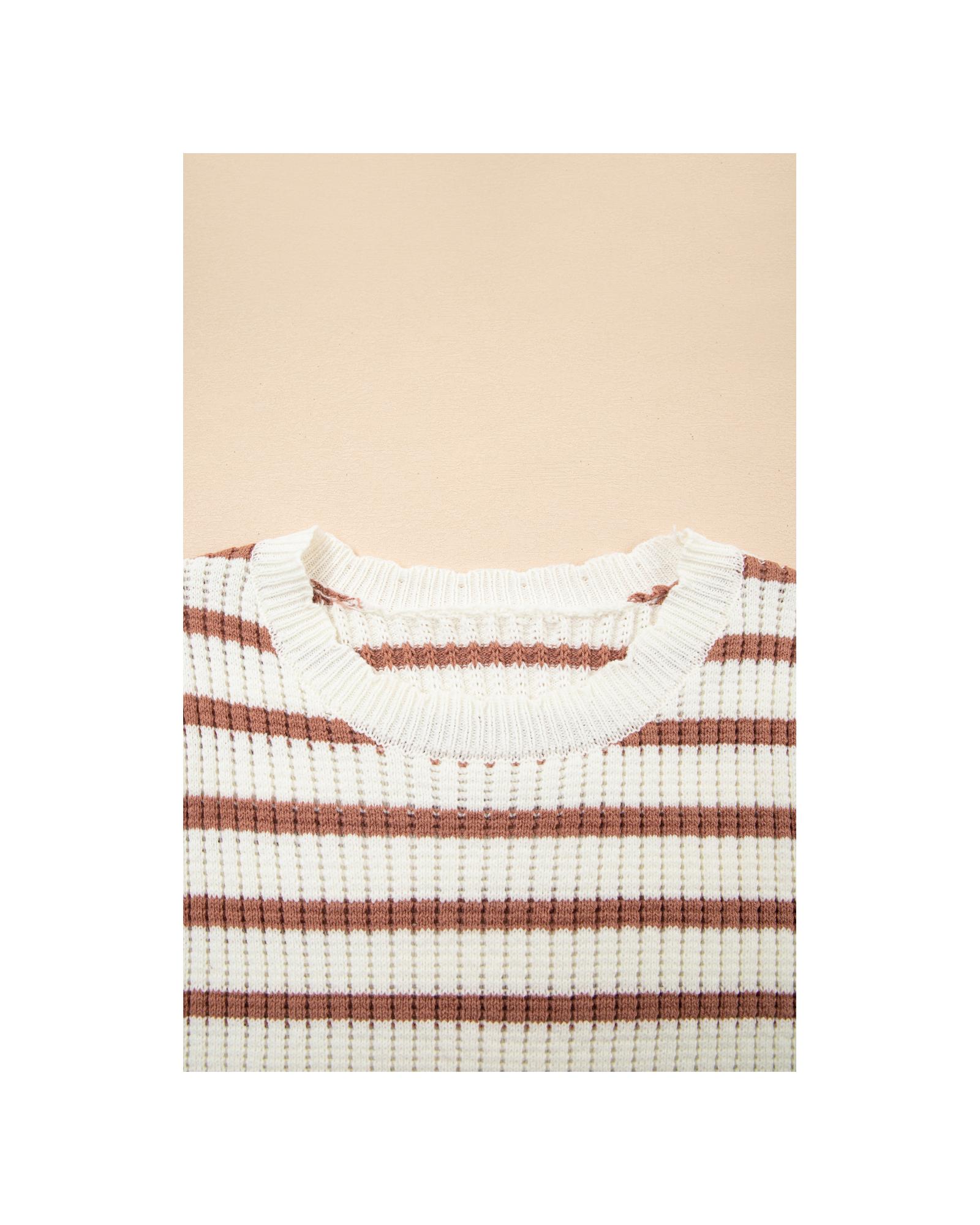 Khaki Stripe Scalloped Round Neck Short Sleeve Sweater – L