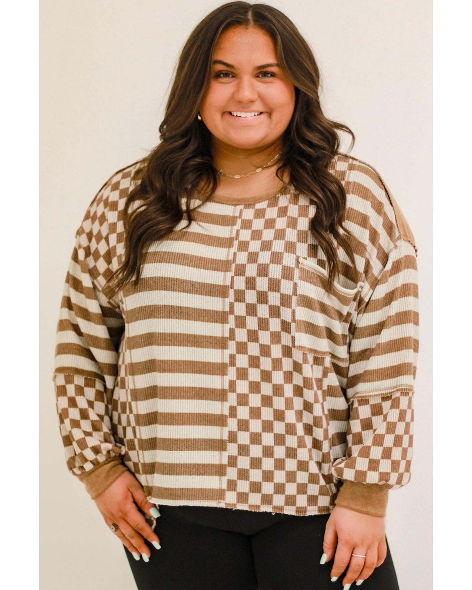 Khaki Striped Checkered Mixed Print Chest Pocket Casual Plus Size Top – 3X