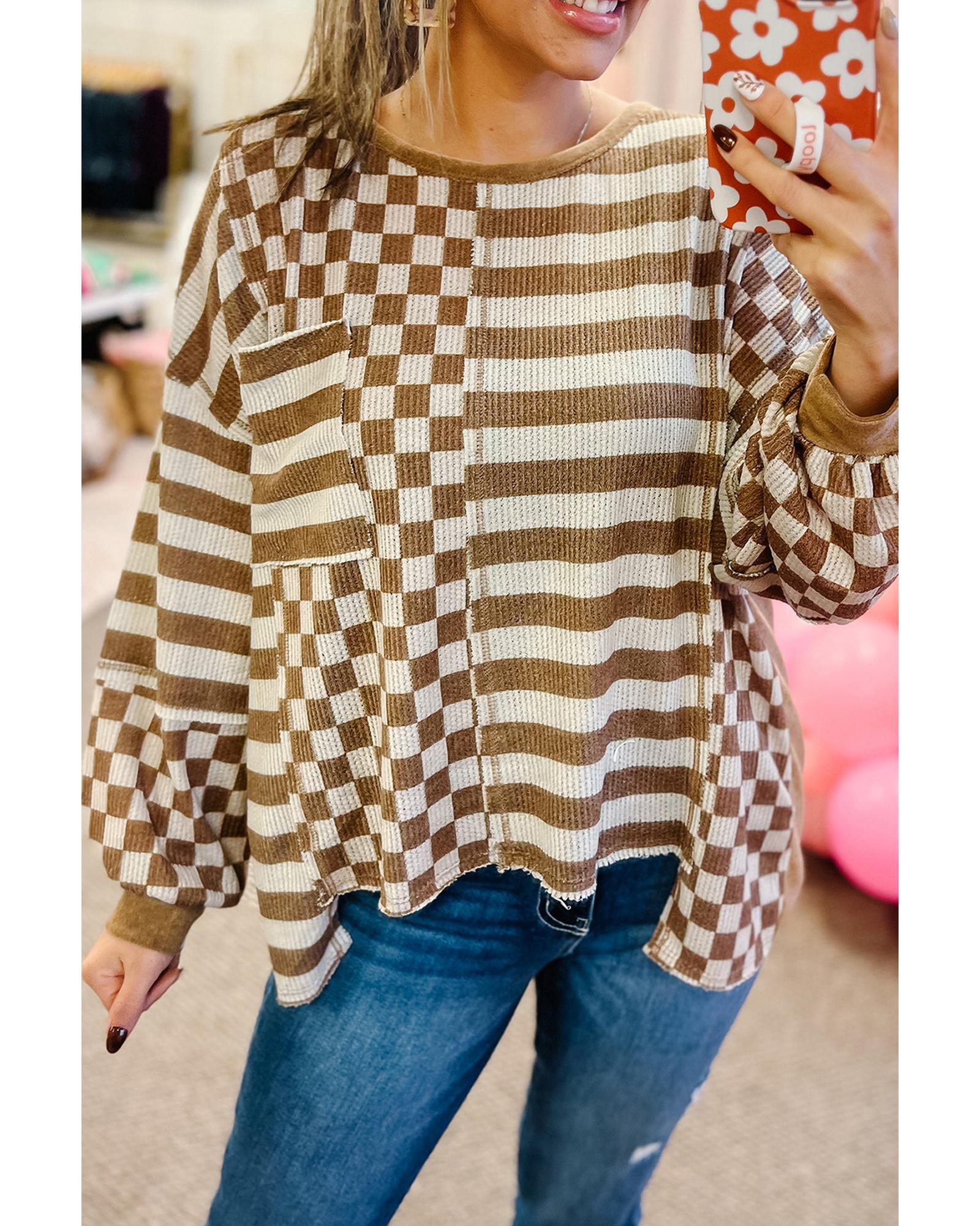 - Khaki striped checkered mixed print casual top