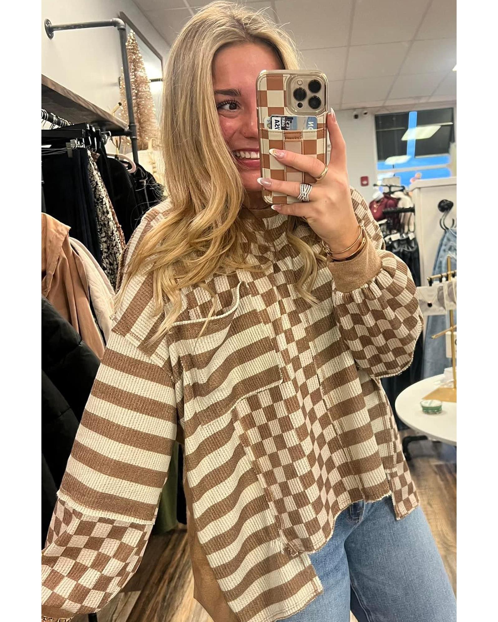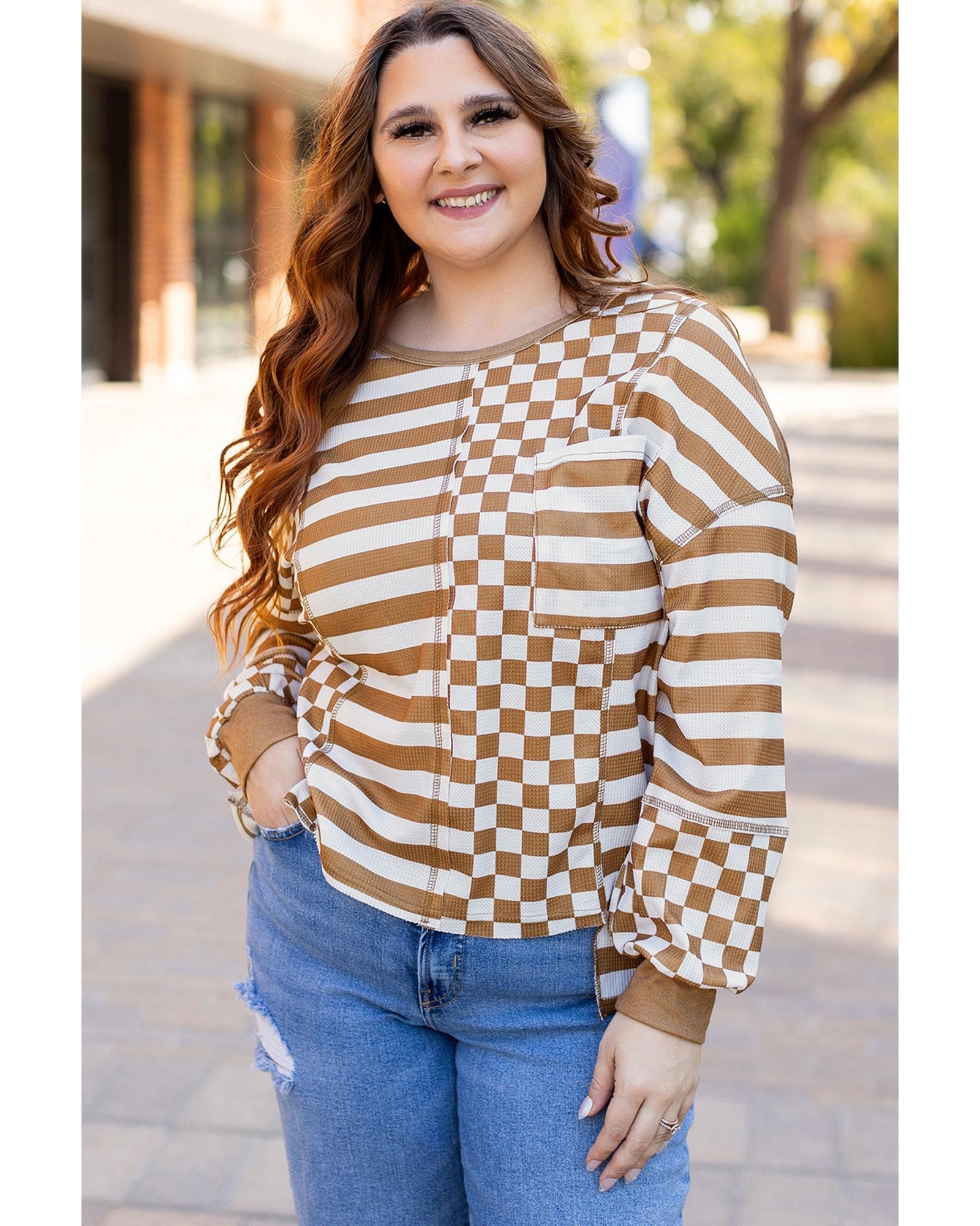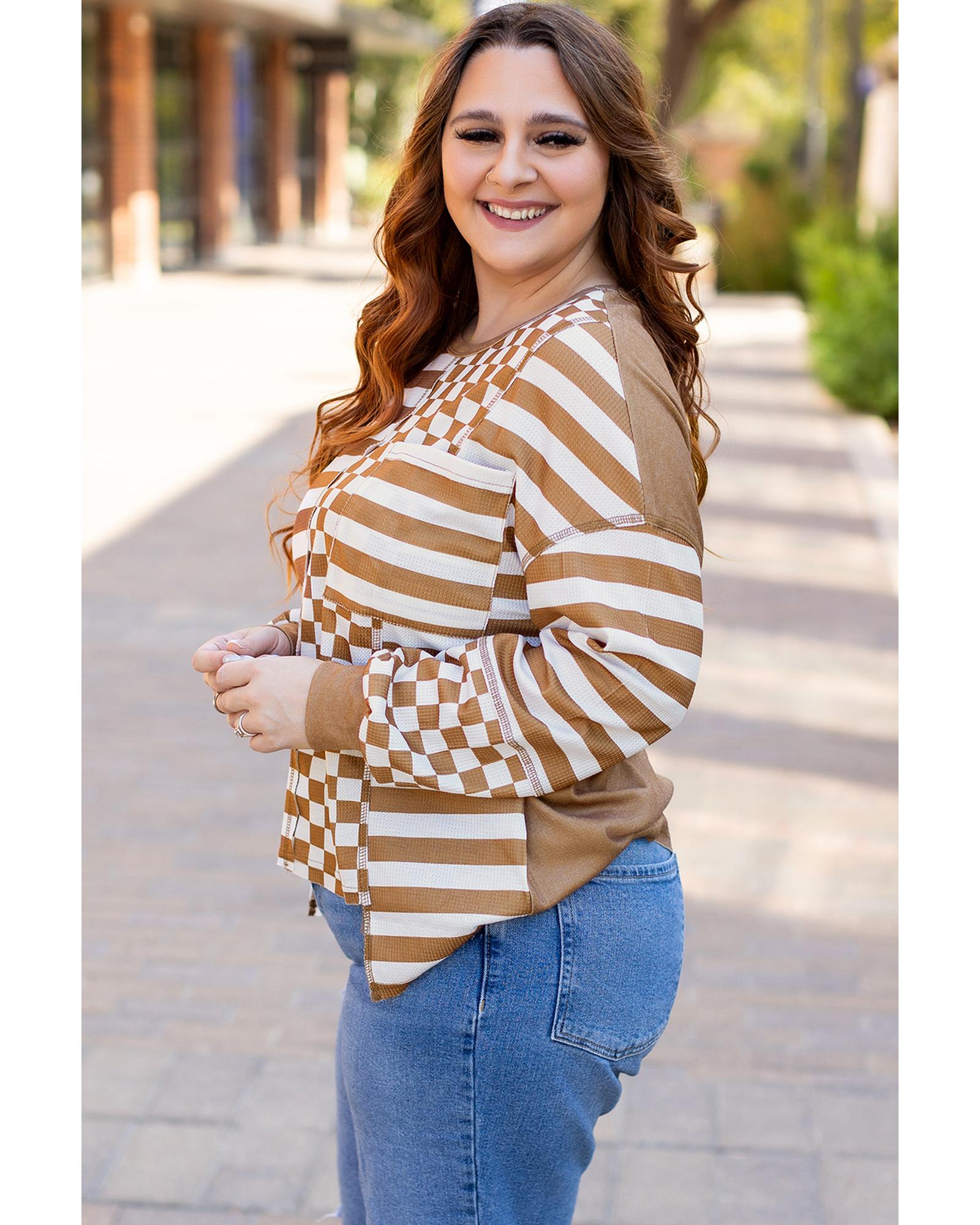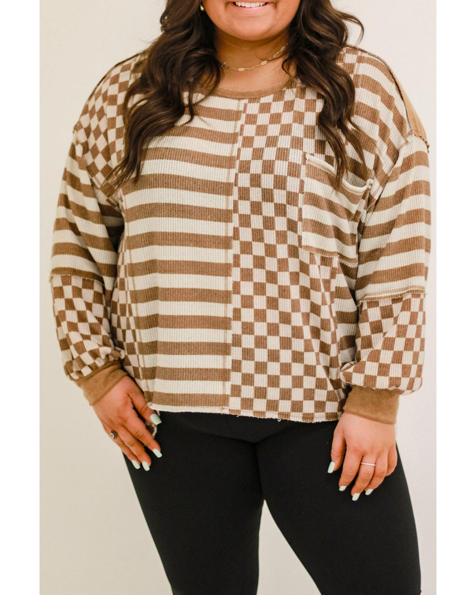 - Khaki striped checkered mixed print casual top