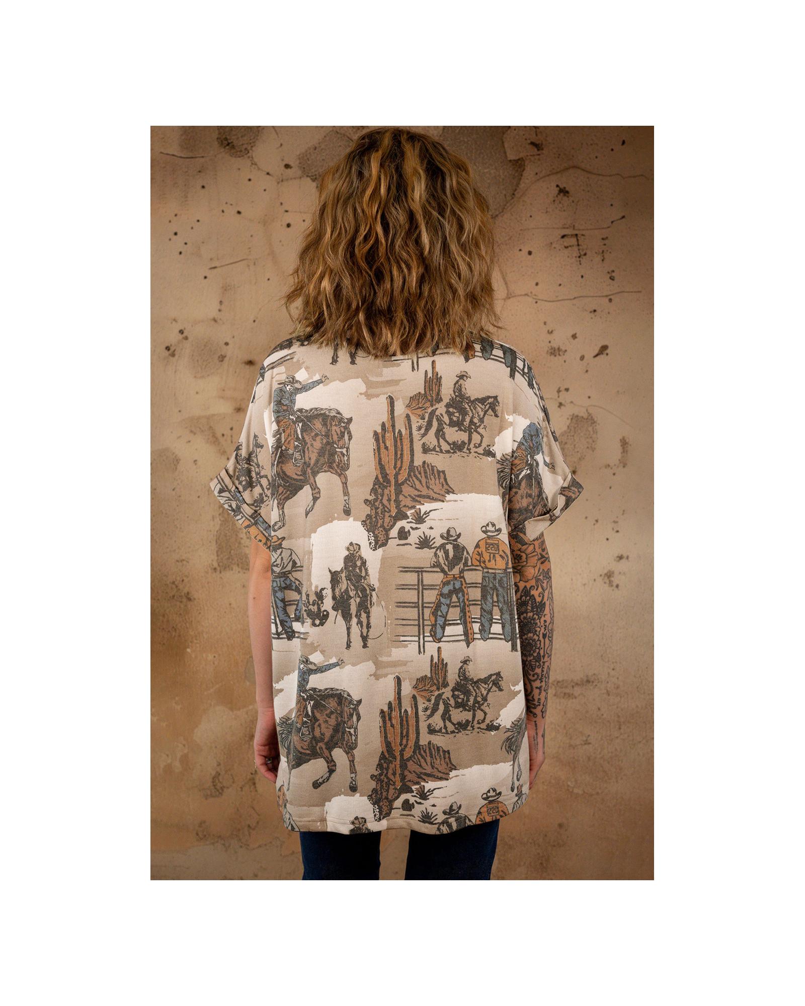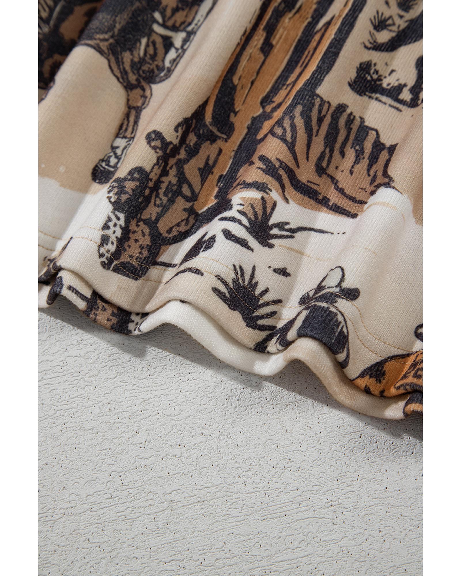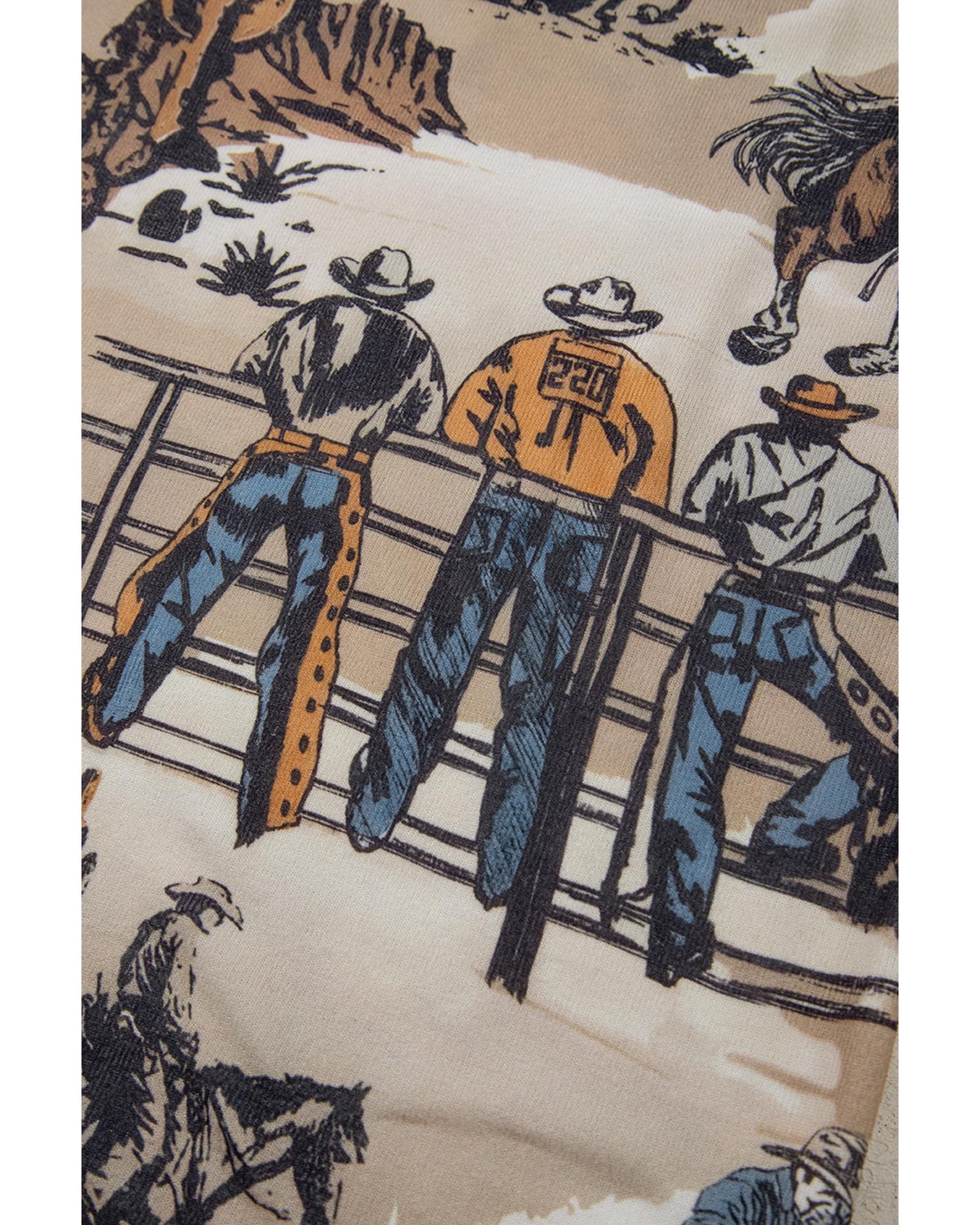 Khaki Western Cowboy Print Cuffed Sleeve Crewneck T Shirt – L