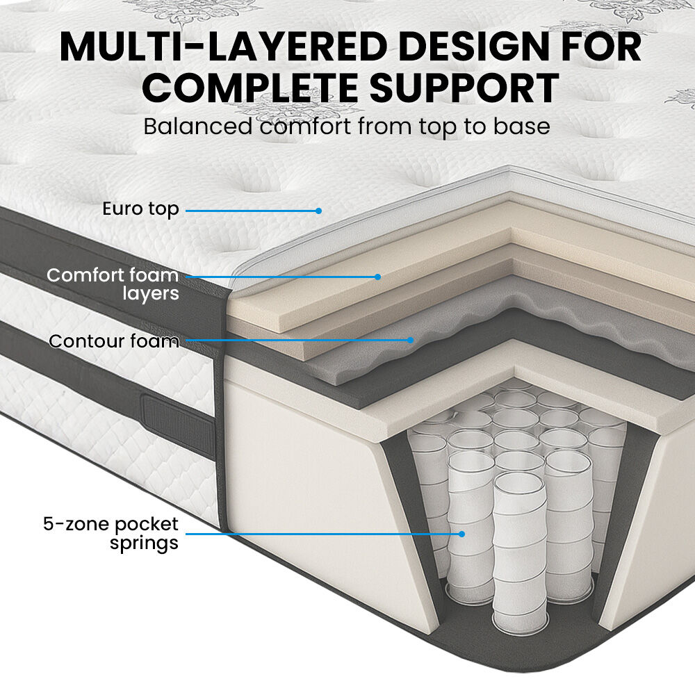 KINGSTON SLUMBER Luxury 34cm King Mattress, Medium Firm, Euro Top, 5-Zone Pocket Spring Foam