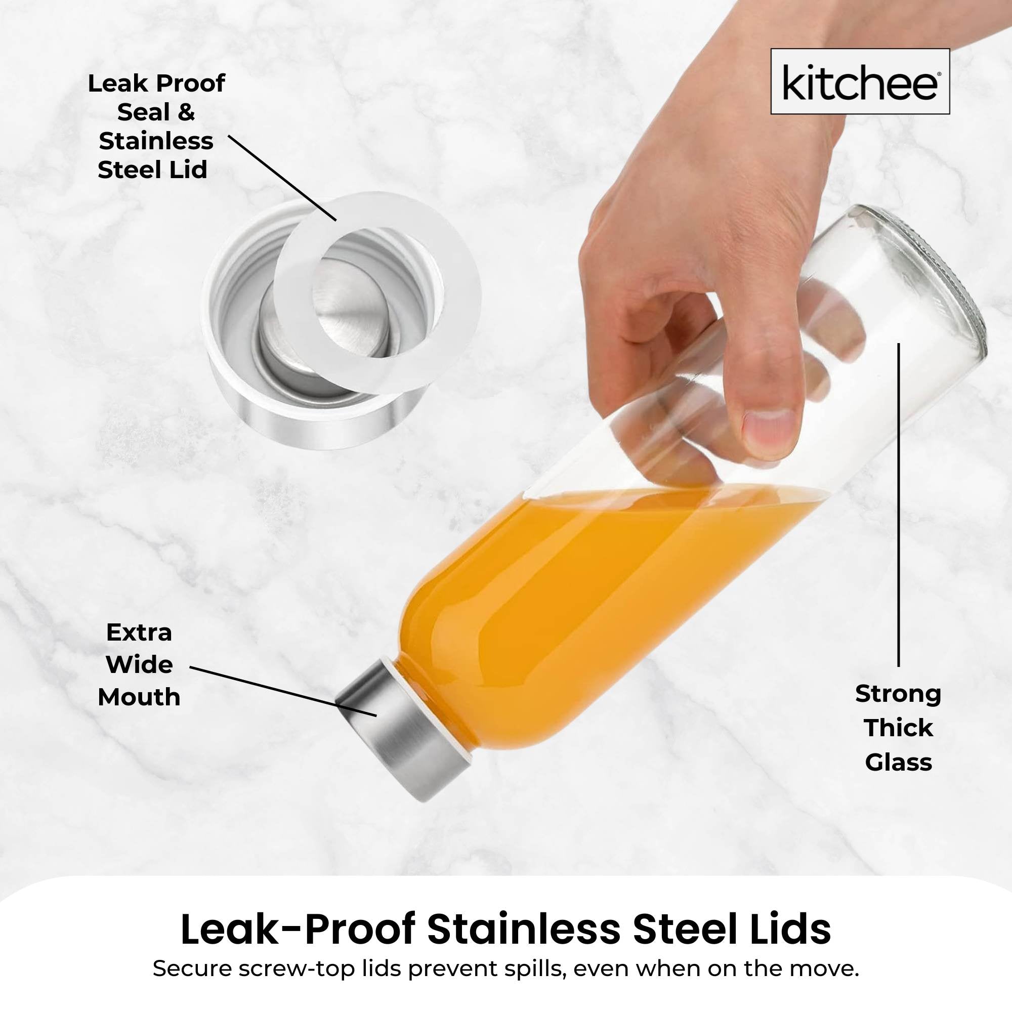 Kitchee 500ml Glass Water Bottle with Stainless Steel Lid – Set of 6 Drink Bottles