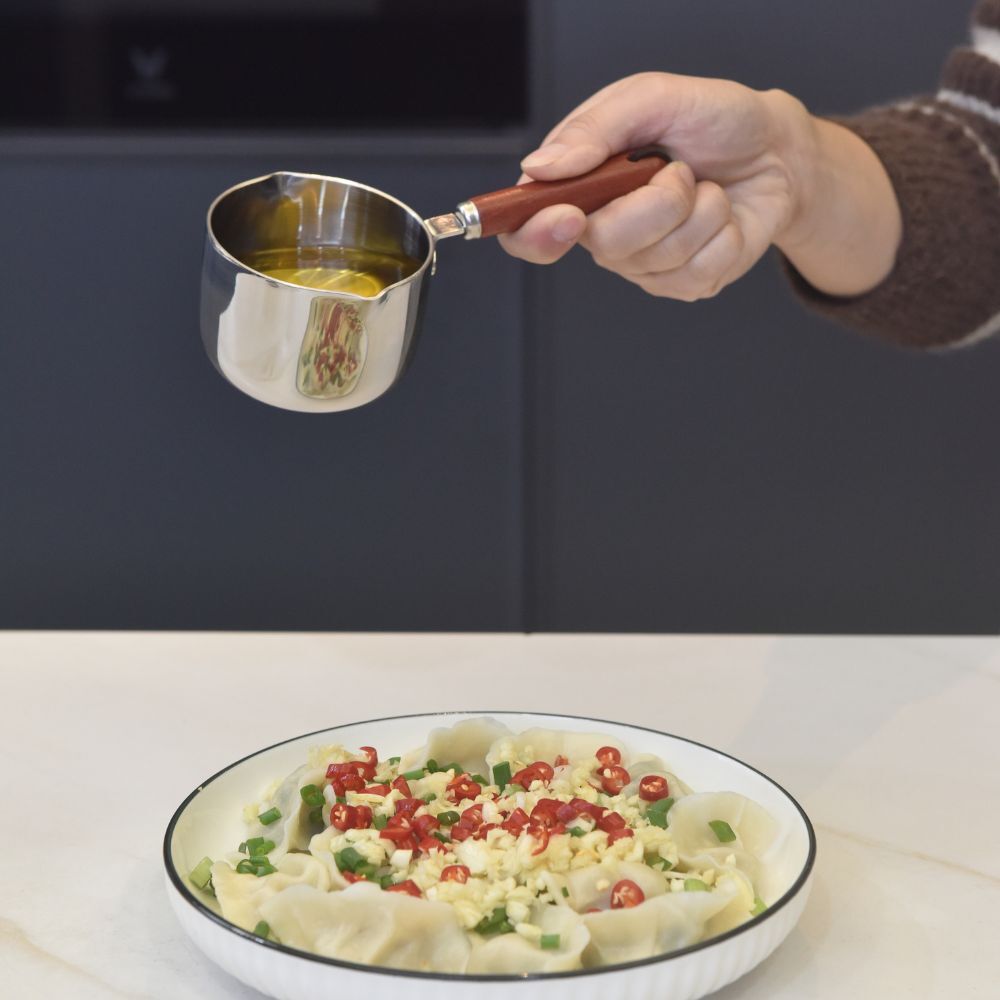 The Kylin 304 Stainless Steel Oil Poured Pot with Wood Handle 120ml is a durable and stylish kitchen tool designed for dispensing oil or other liquids while cooking.