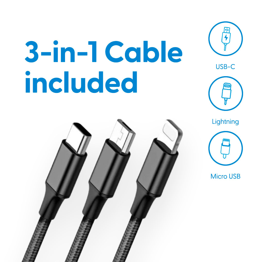 - 3-in-1 Cable Included: Charge multiple devices with USB-C, Micro USB, and Lightning compatibility all from one cable.