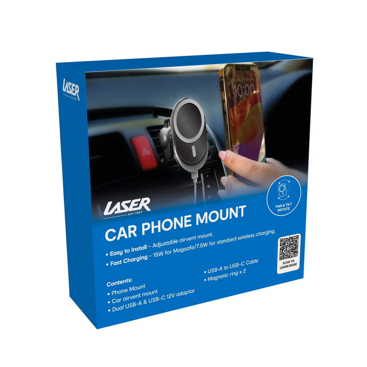 Charge your iPhone or compatible smartphone effortlessly while on the road with the Laser 15W Car Phone Mount. Designed with MagSafe compatibility and fast wireless charging, this mount ensures secure, reliable charging while keeping your device accessible.
