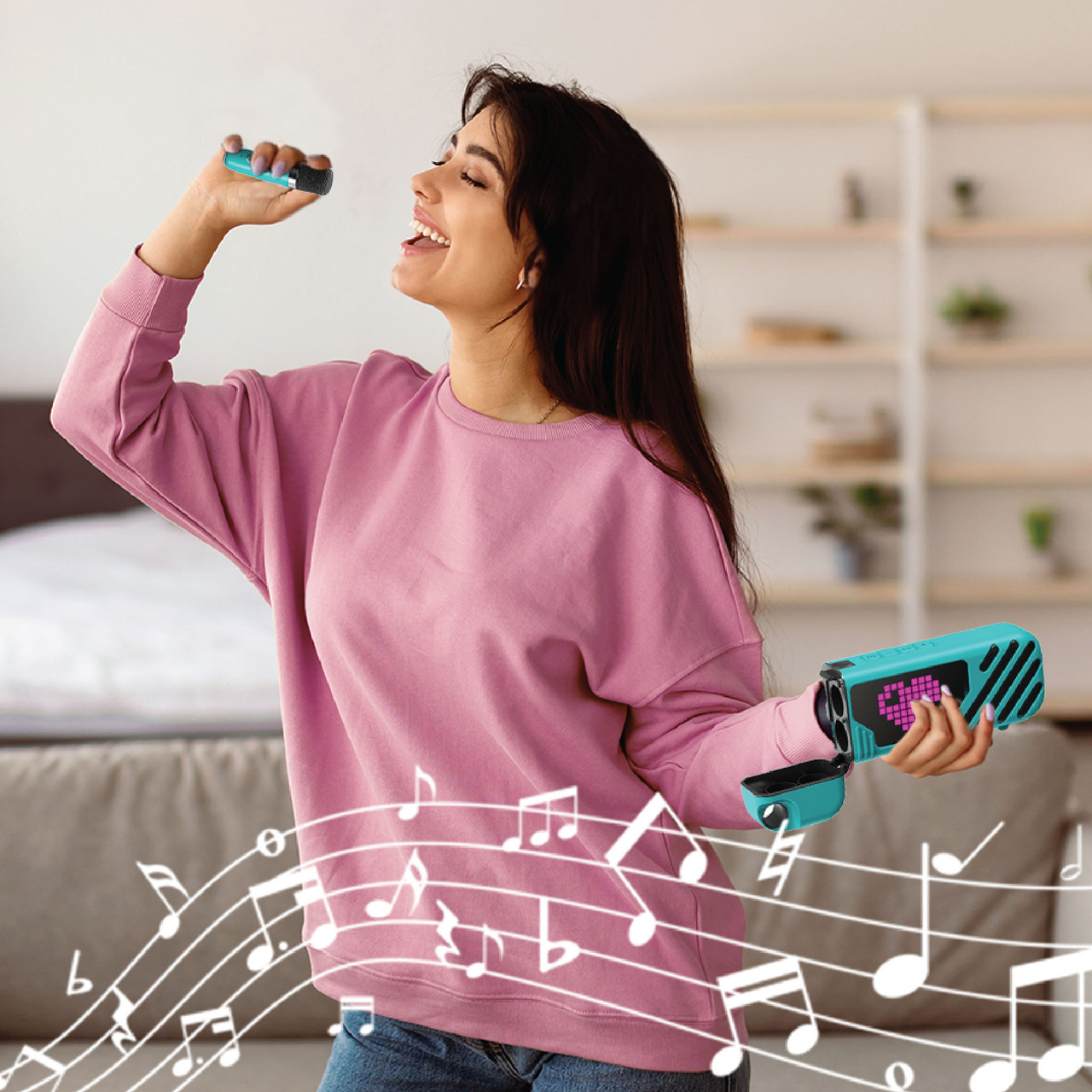 - Two Wireless Microphones: Sing solo or duet with a friend, with complete freedomno tangled cords or interruptions.