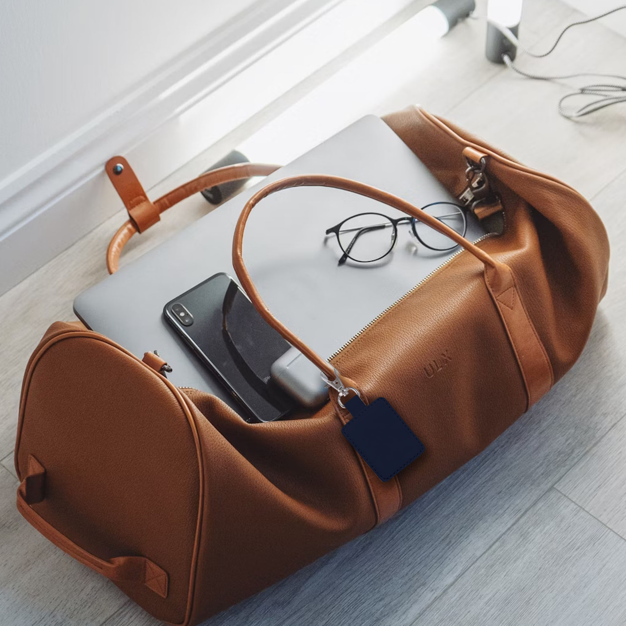 The Laser Smart Tag Key Ring Navy Blue easily attaches to keys or bags and works with Apples Find My network.