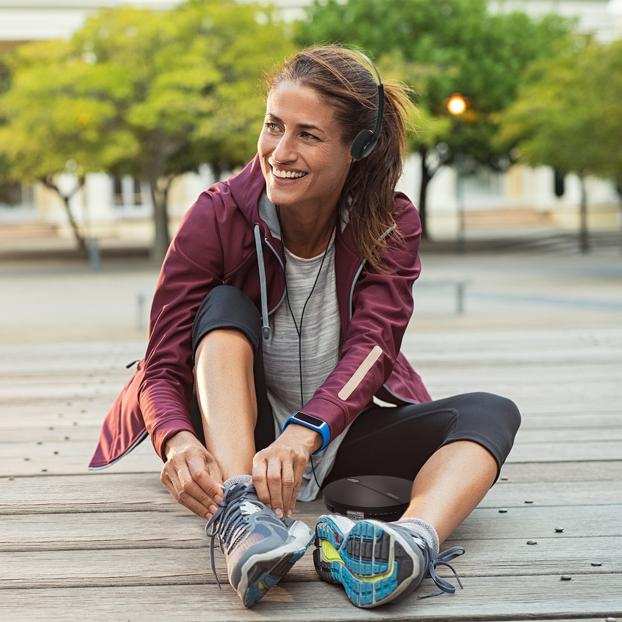 Then, connect your headphones or to your bookshelf speaker for a great music experience. Plus, anti-skip buffering technology ensures uninterrupted playback even on the move.