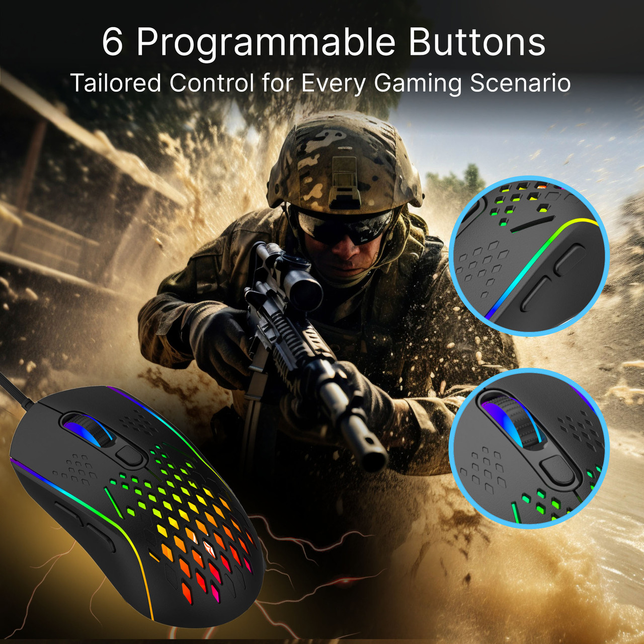With 13 different lighting modes, 6 individual buttons and DPI settings for easy navigation.