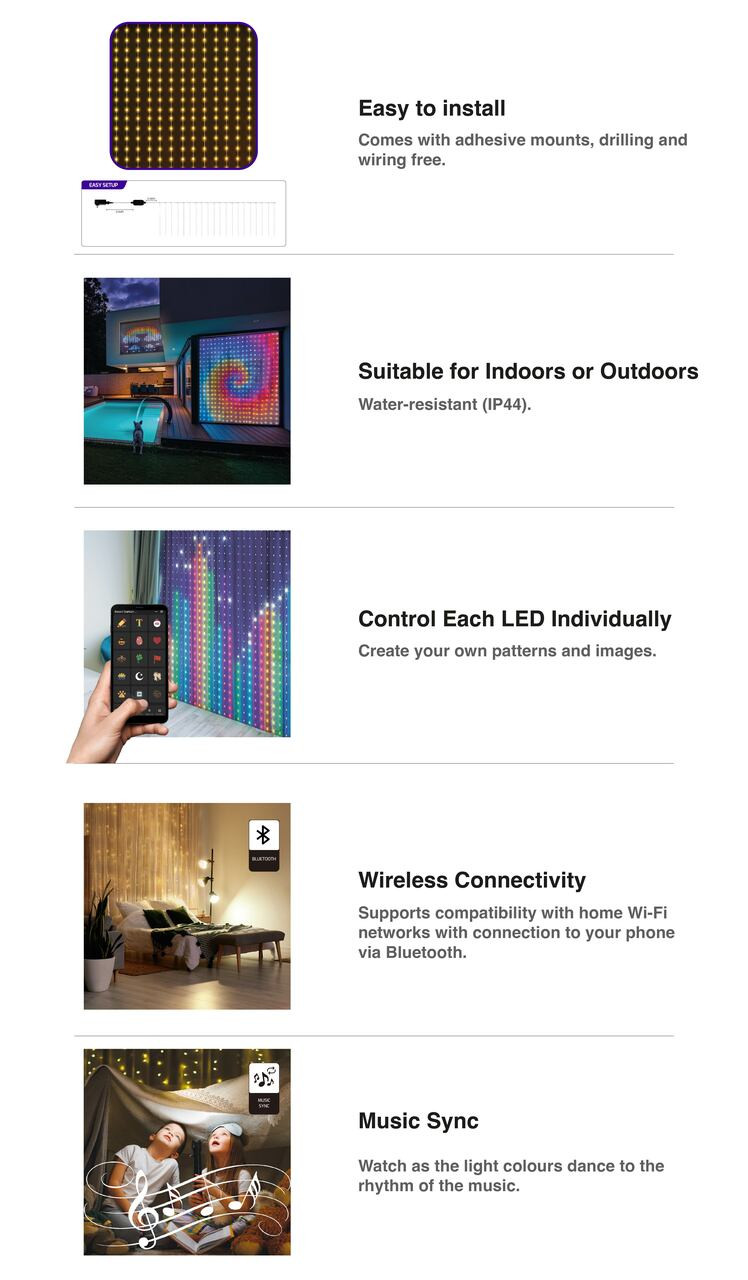 - Easy Installation 6M LED strip suits up to 85-inch TVs and attaches easily with adhesive backing.