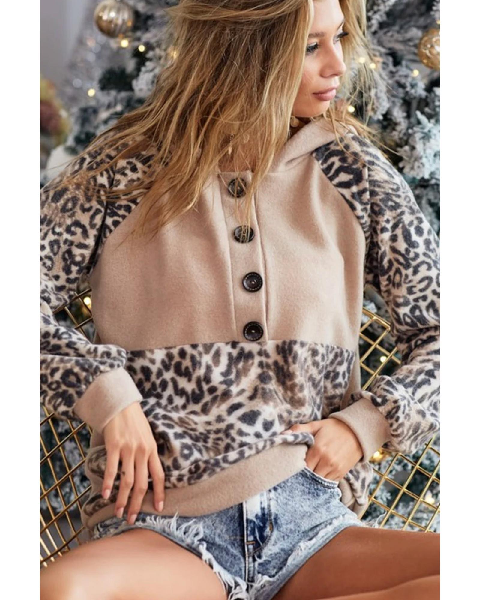 Leopard Print Buttoned Neckline Raglan Sleeve Hoodie – M