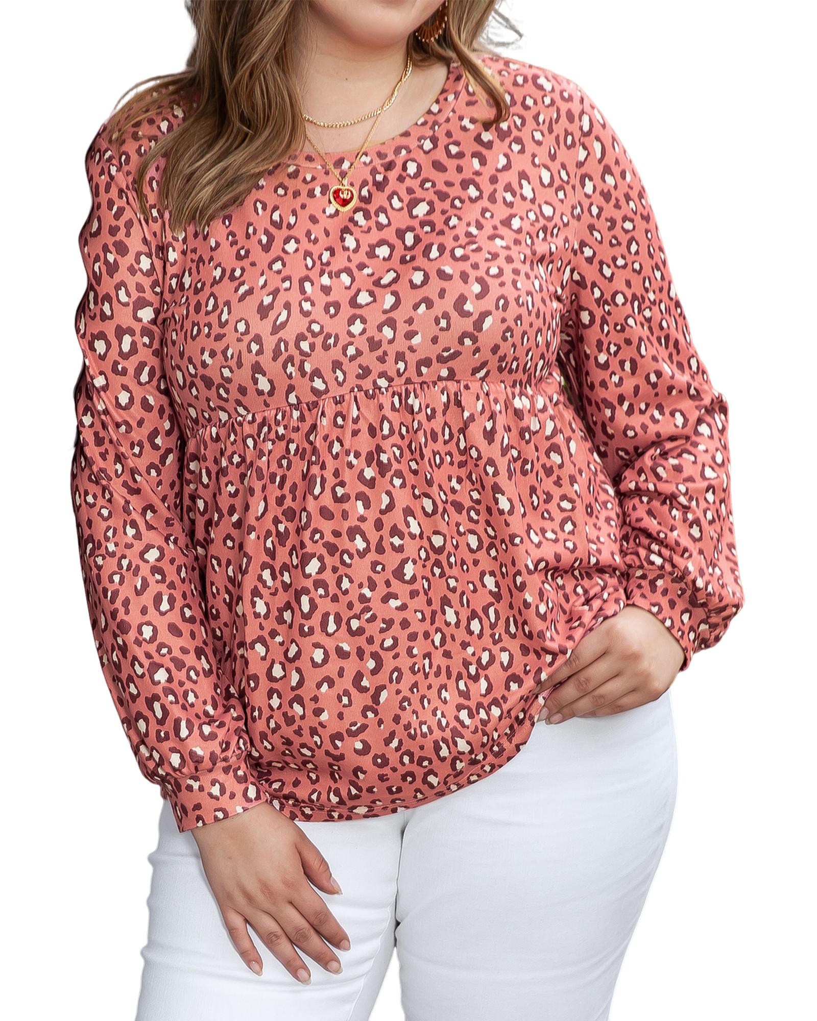 Leopard Print Long Sleeve Ruffled Babydoll Plus Size Blouse – 3X