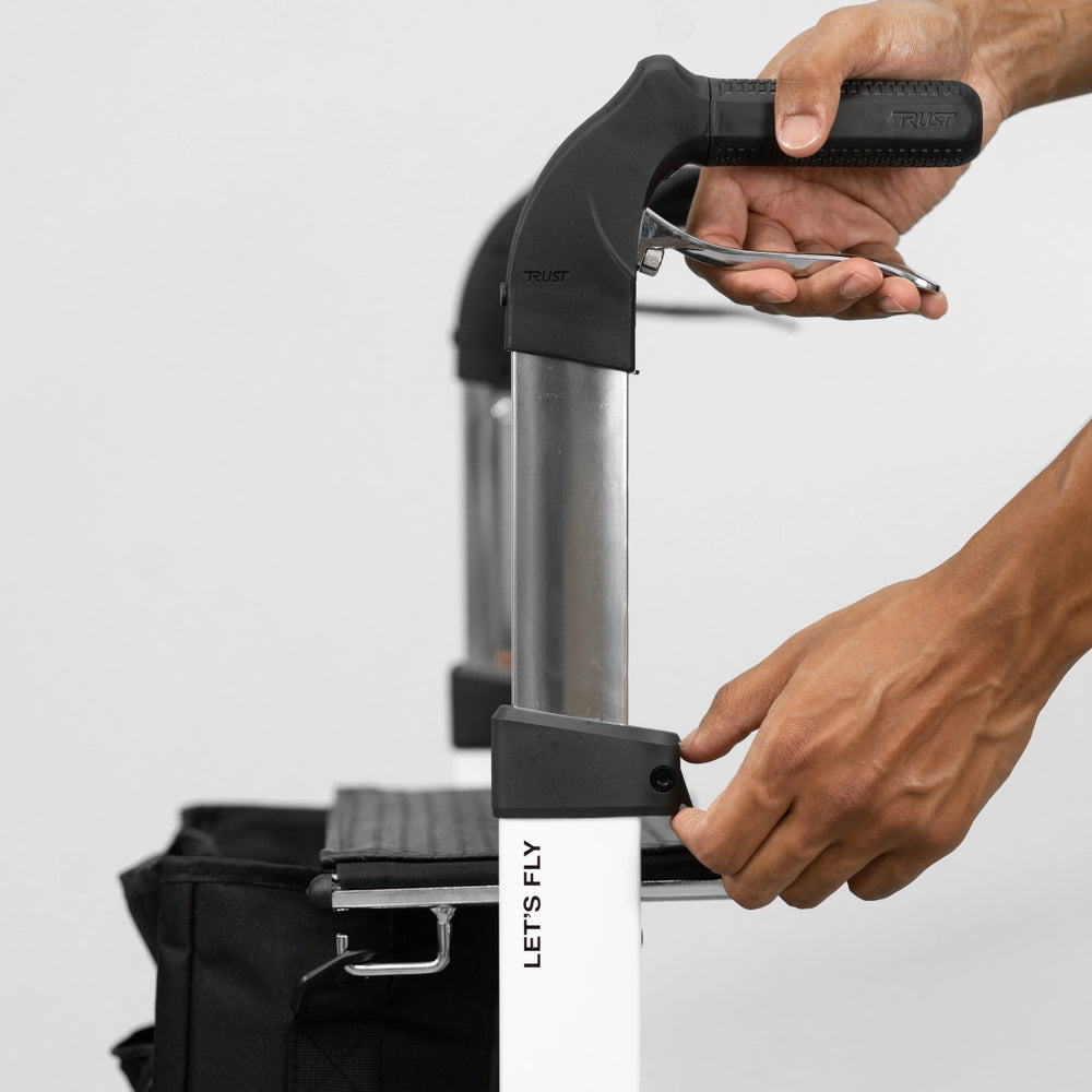 The ergonomically designed rubber handles on Let’s Fly gives you a safe and comfortable grip. The handles have a small bump in front of your thumb to give extra support. Beneath the rubber grip is the brake handle that has a screw to adjust the brakes. The handles on Let’s Fly are adjustable between 78,5-92 cm to suit different users. Lets fly gives you a comfortable walk wherever you decide to go.