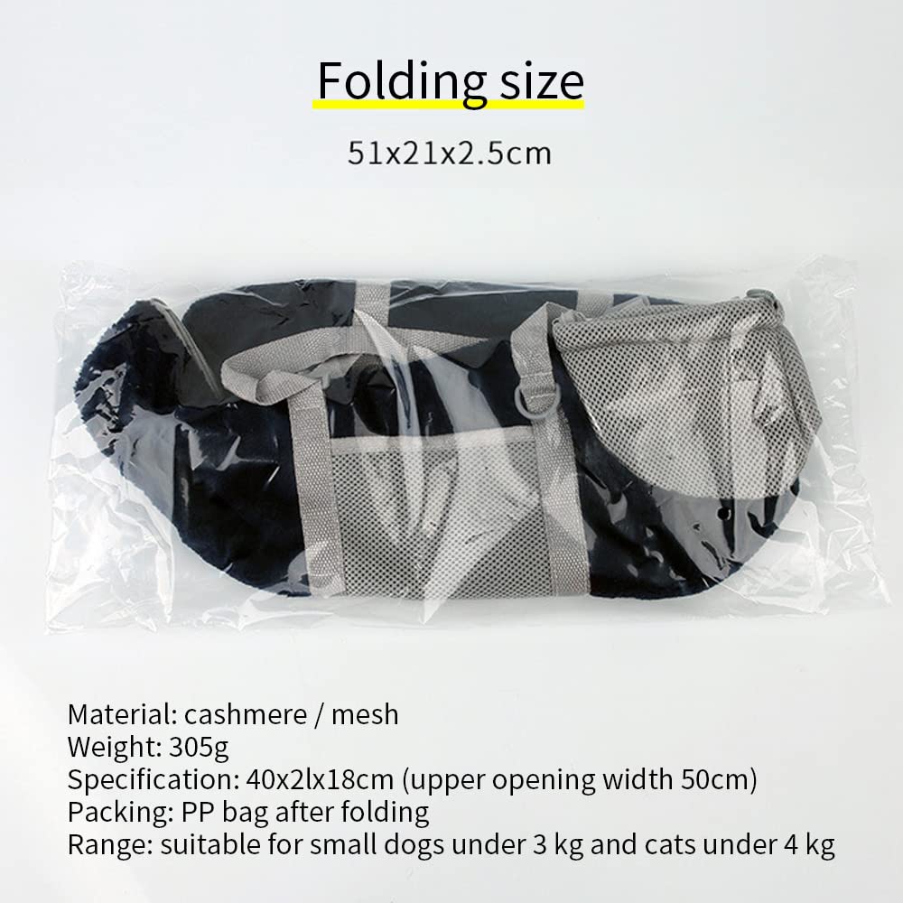 The cat carrier bag is made of lambskin and mesh fabric, combining softness and breathability. It is designed to accommodate dogs weighing up to 3kg and cats weighing up to 4kg. The shoulder strap is adjustable, allowing for easy carrying by hand or over the