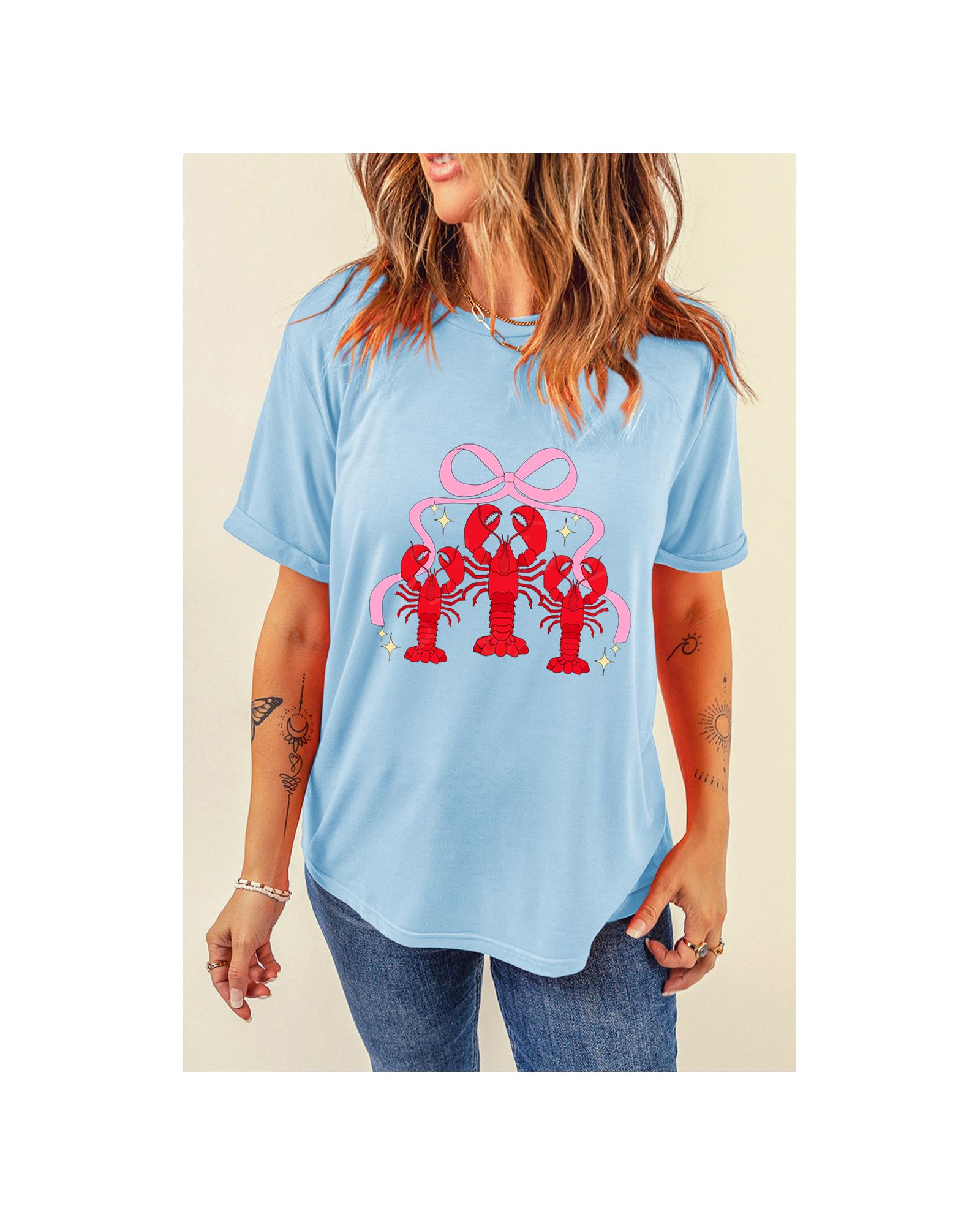 Light Blue Bow Crawfish Printed Relaxed Fit T Shirt – L