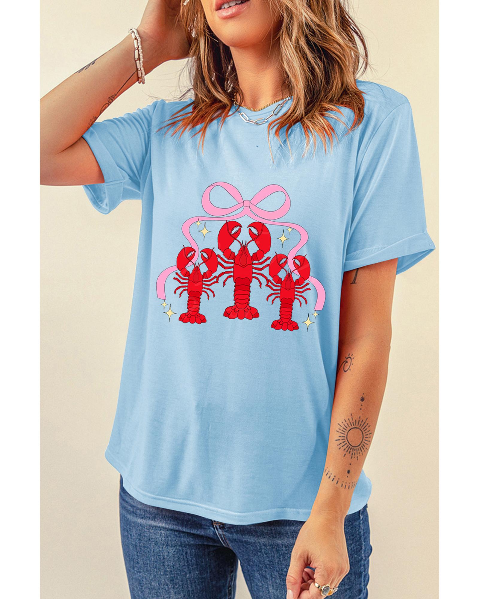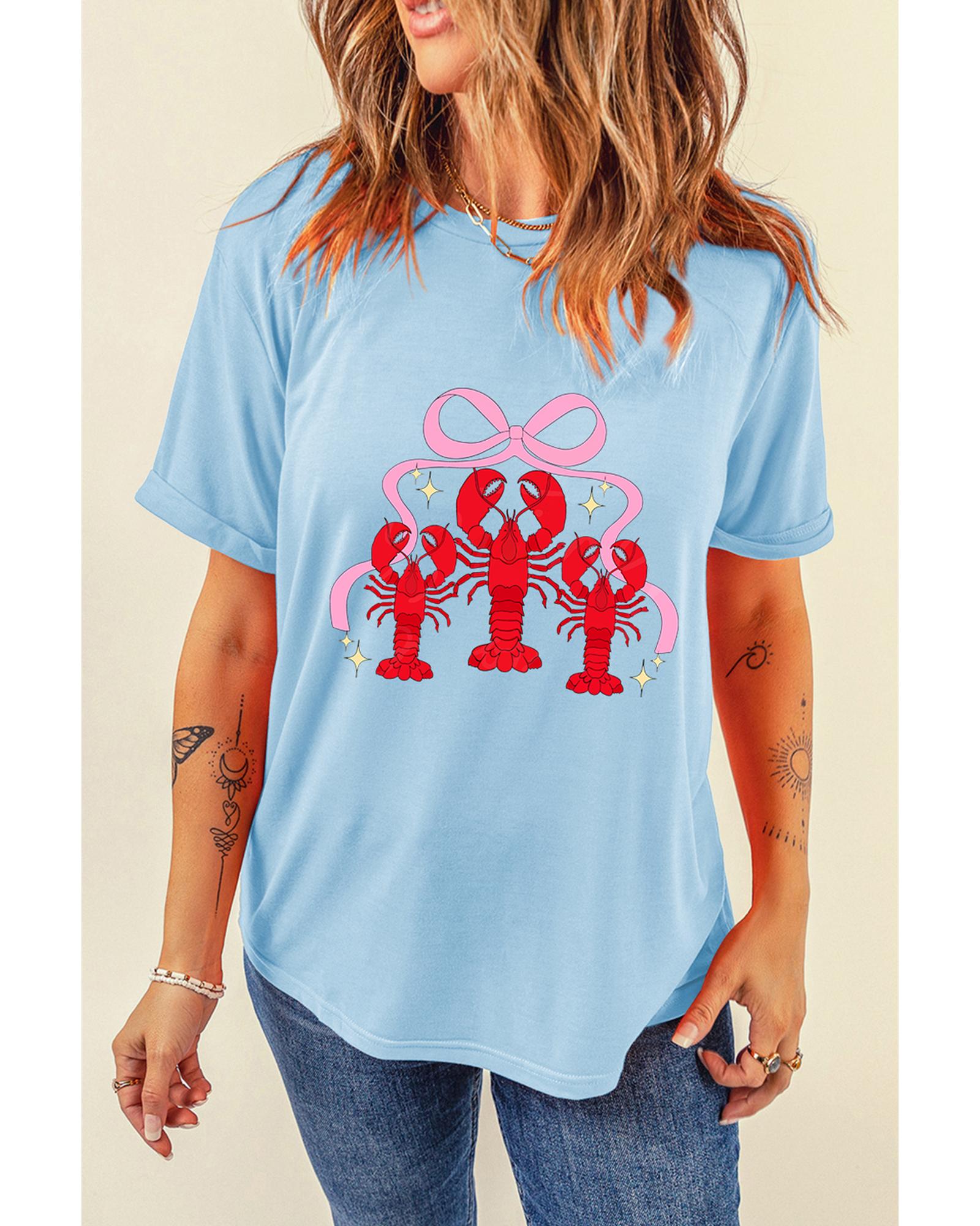 Light Blue Bow Crawfish Printed Relaxed Fit T Shirt – XL