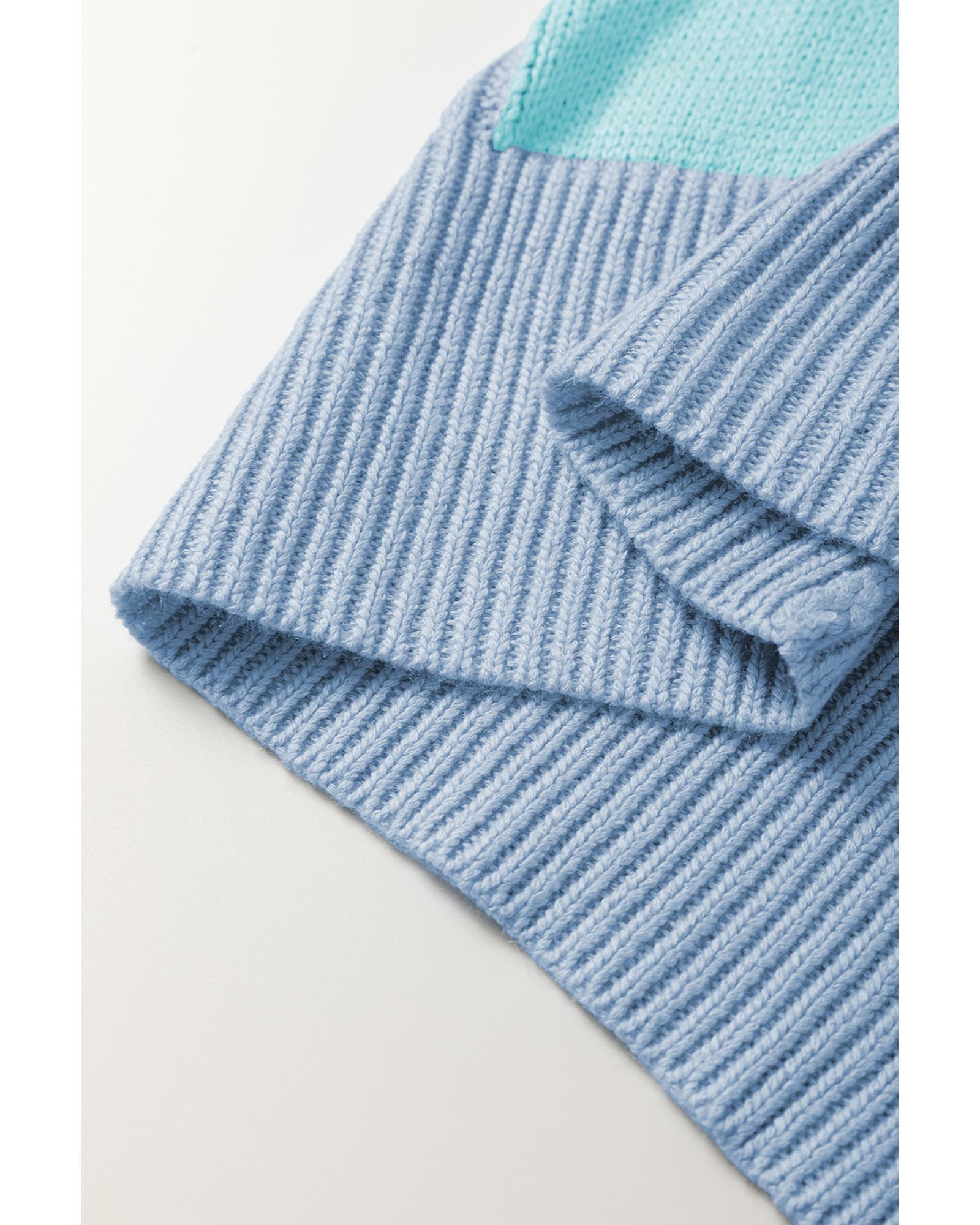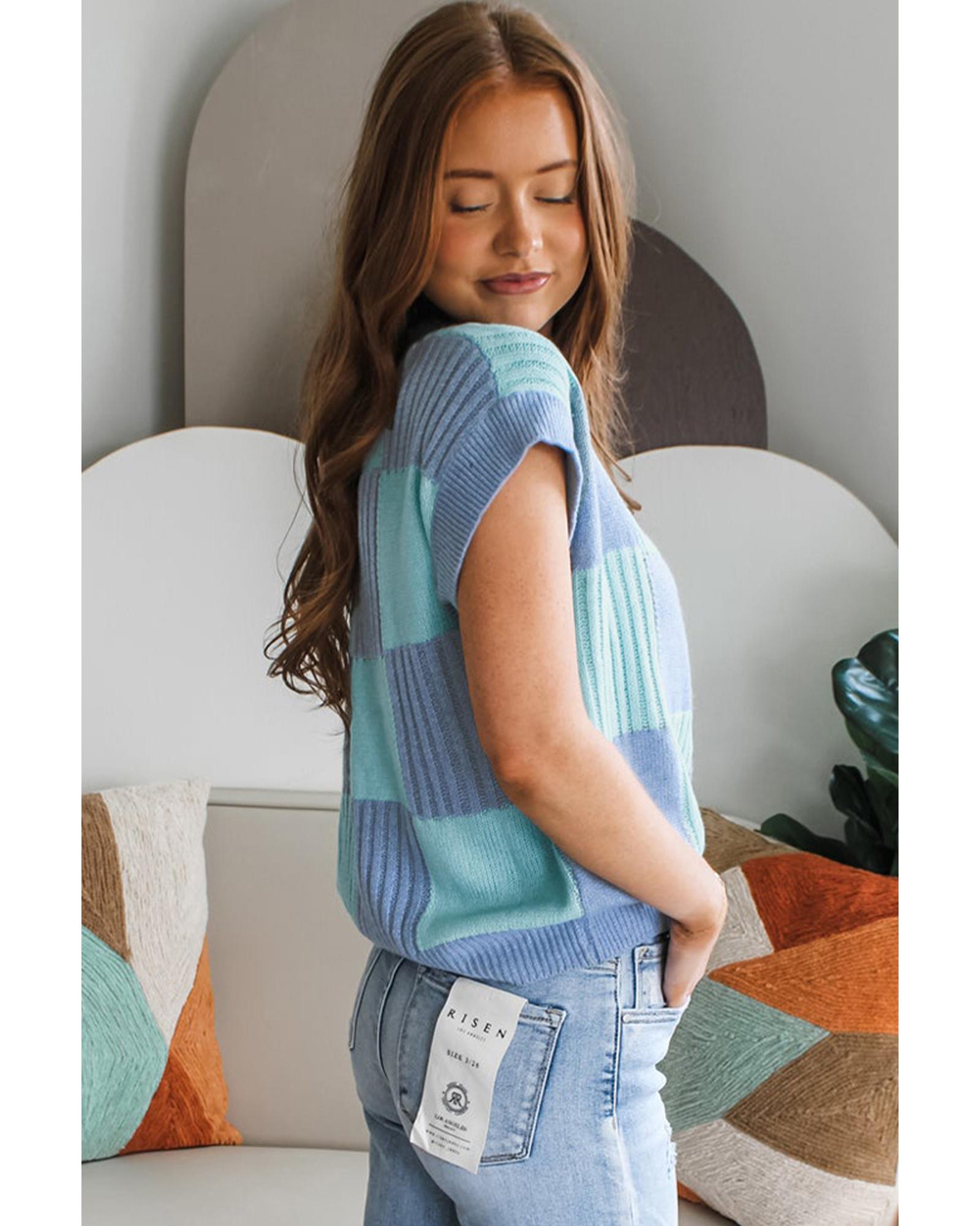 Light Blue Checkered Color Block Crew Neck Short Sleeve Sweater – S