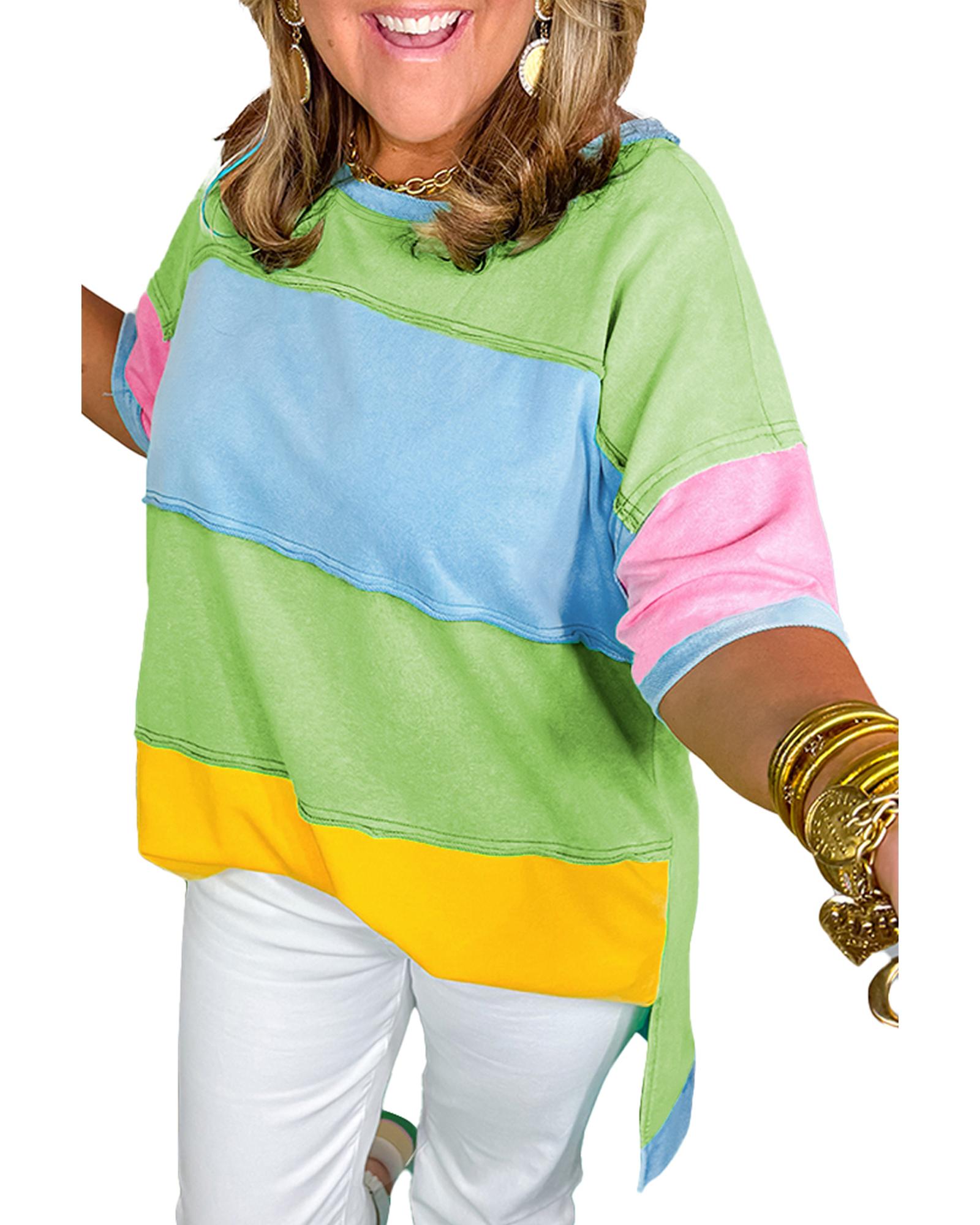 Light Blue Color Block Exposed Seam Patchwork Plus Size T Shirt – 3X