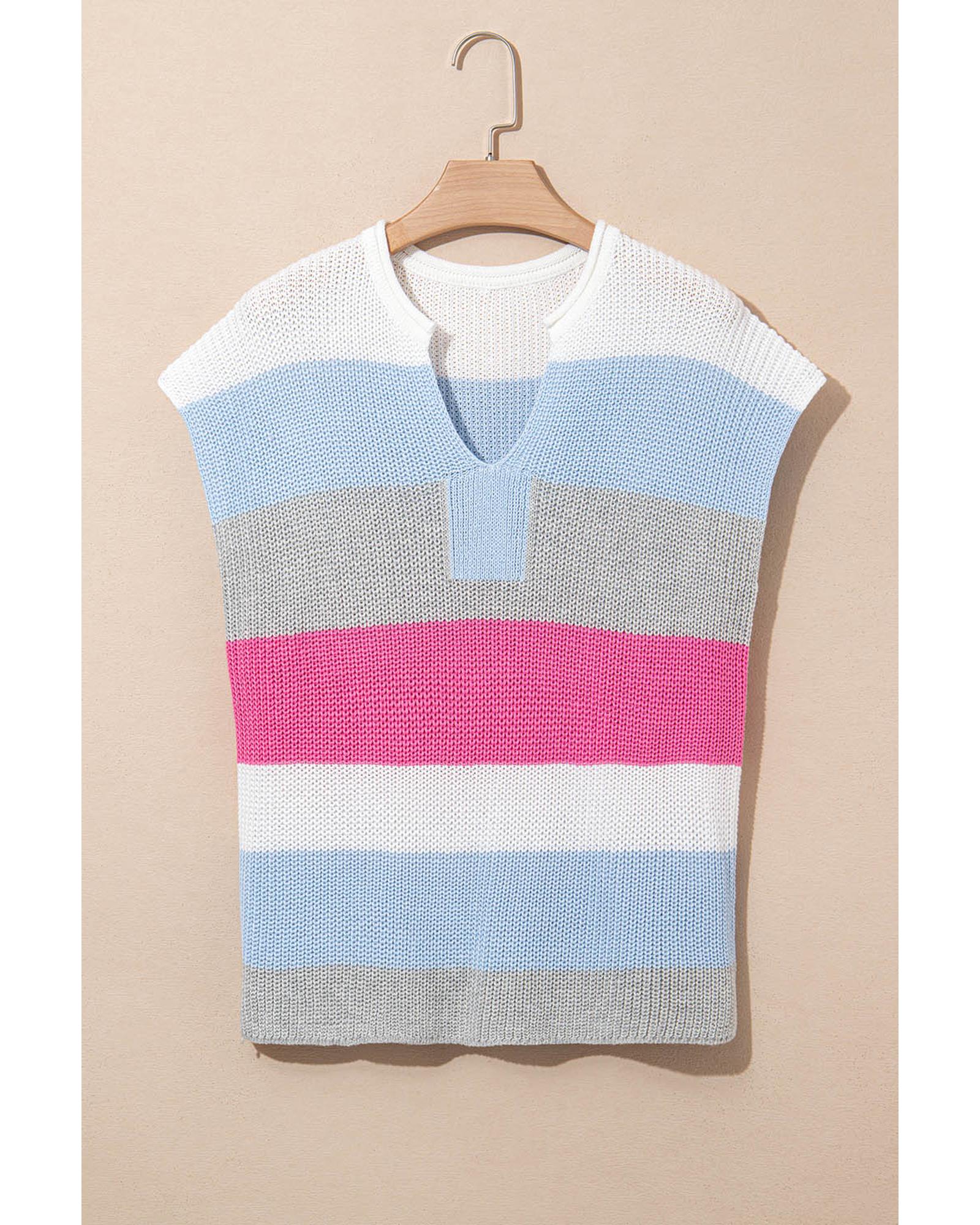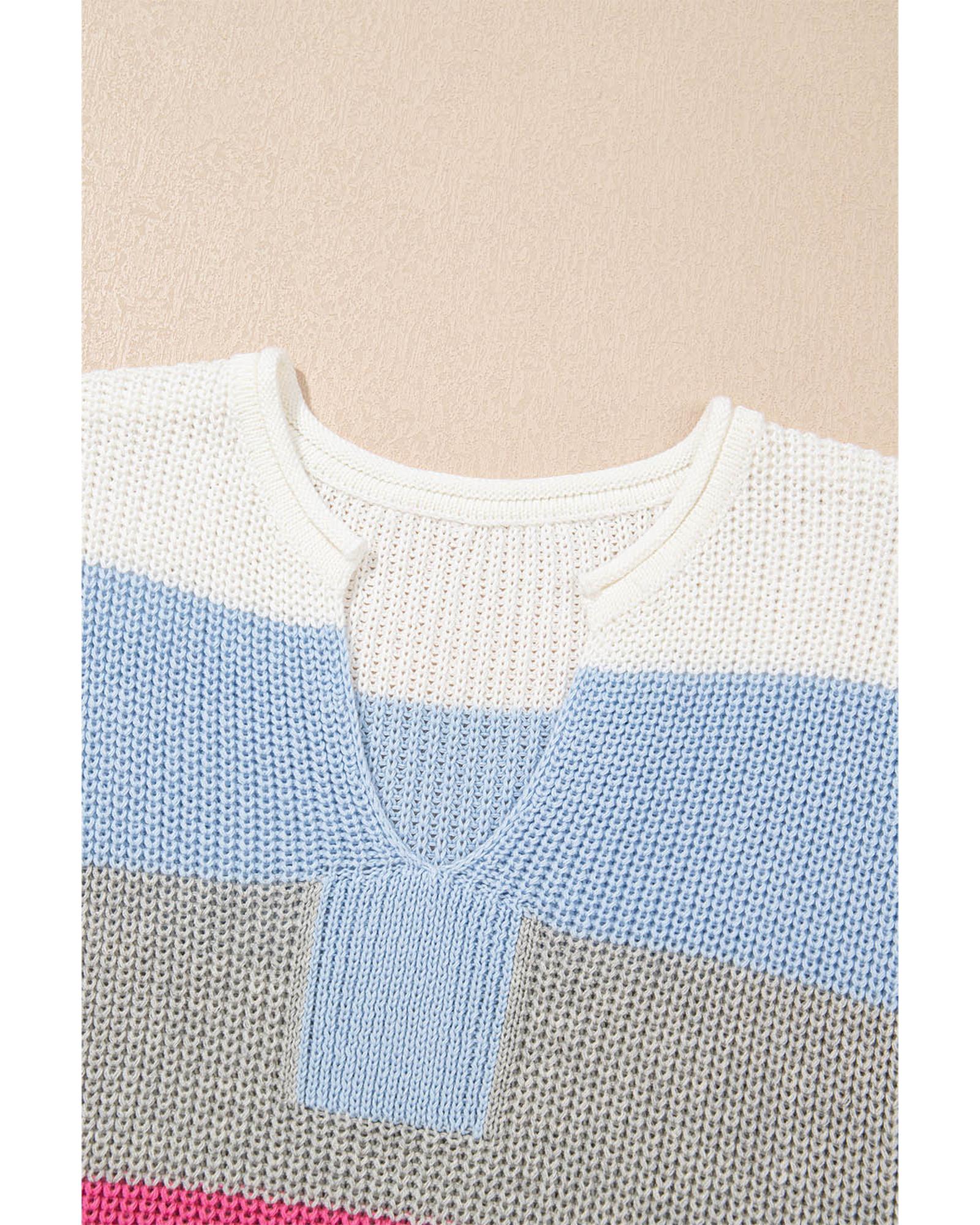 Light Blue Color Block Notch V Neck Sweater T Shirt – M