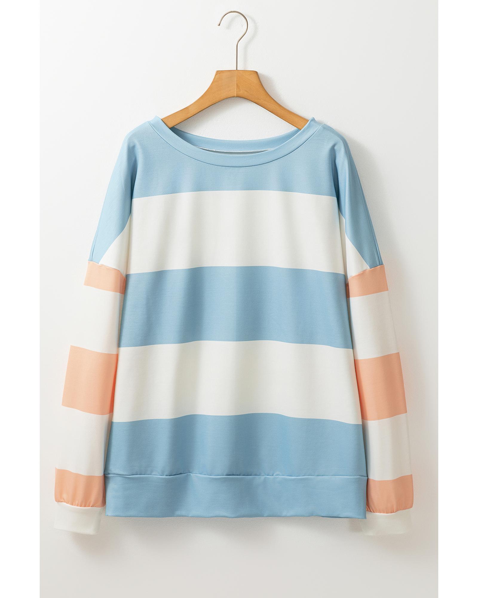 Light Blue Colorblock Striped Drop Shoulder Long Sleeve Top – L