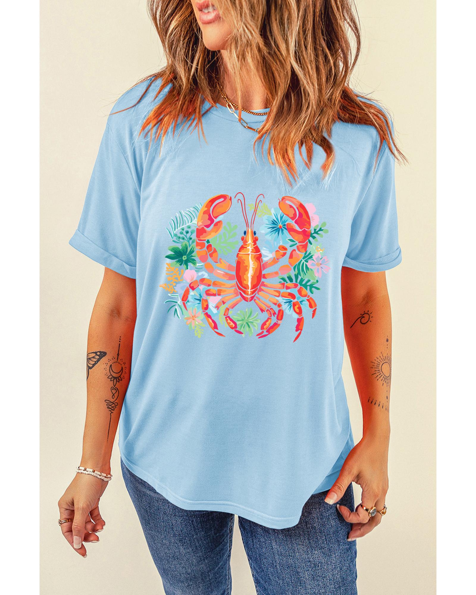 Light Blue Floral Summer Lobster Graphic Tee – M