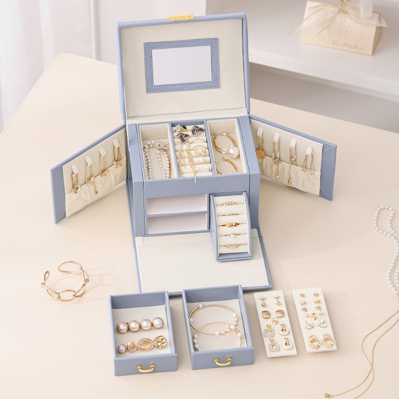 Light Blue Luxury PU Leather Jewelry Storage Box – 3-Tier Organizer with Mirror for Necklaces, Earrings, and Rings(Jewelry is a photo prop and is not included)