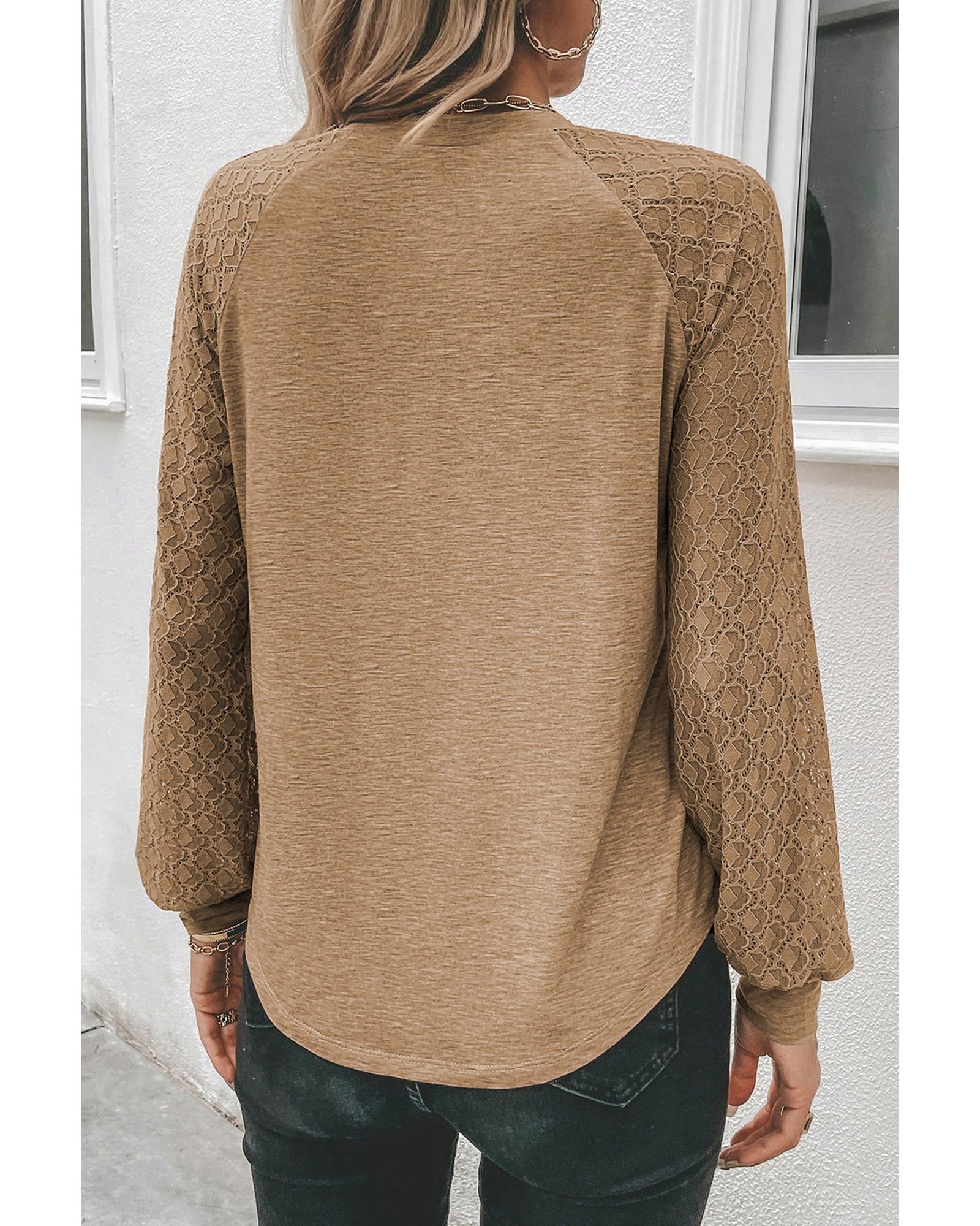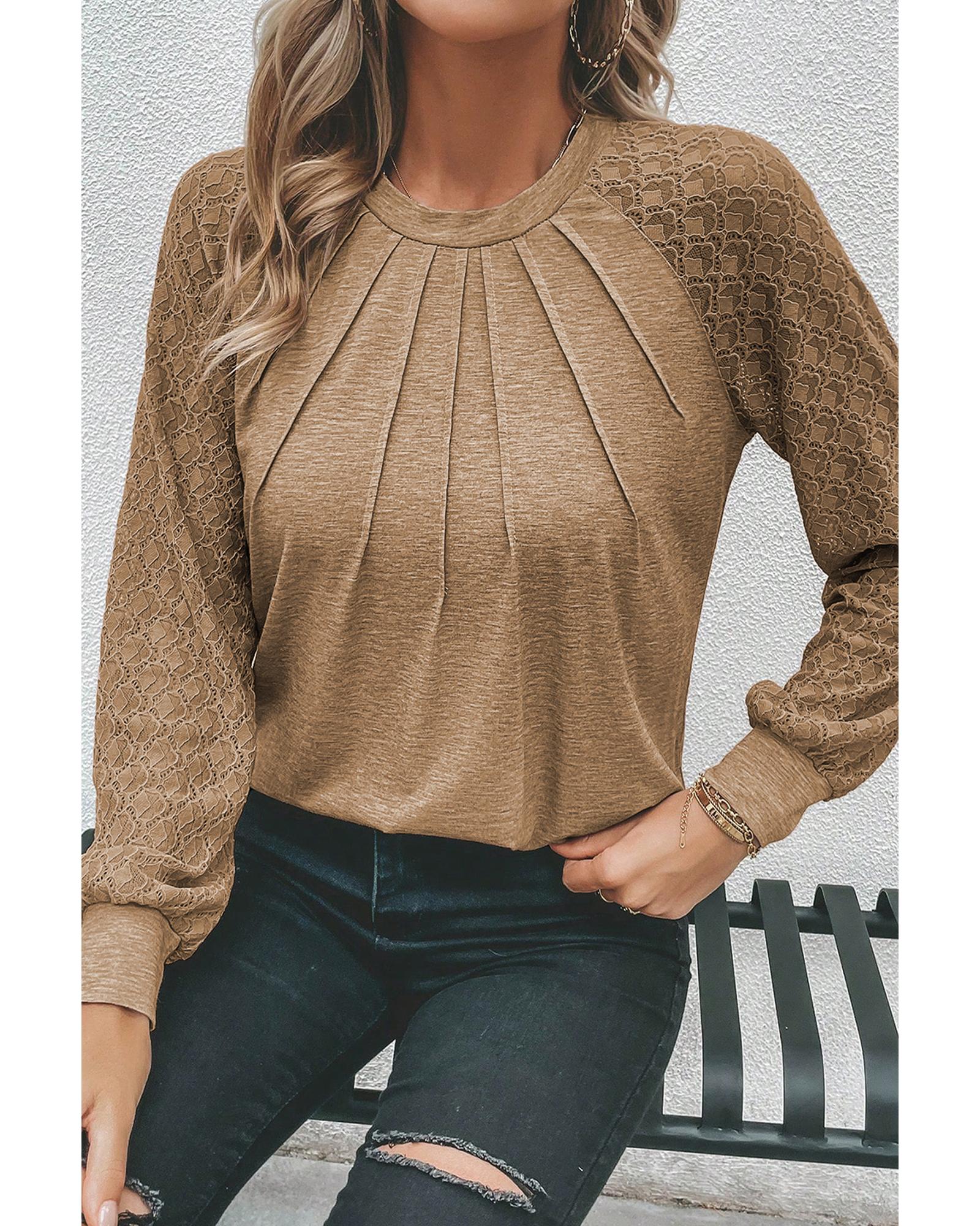 Light French Beige Contrast Lace Raglan Sleeve Plicate Round Neck Top – S