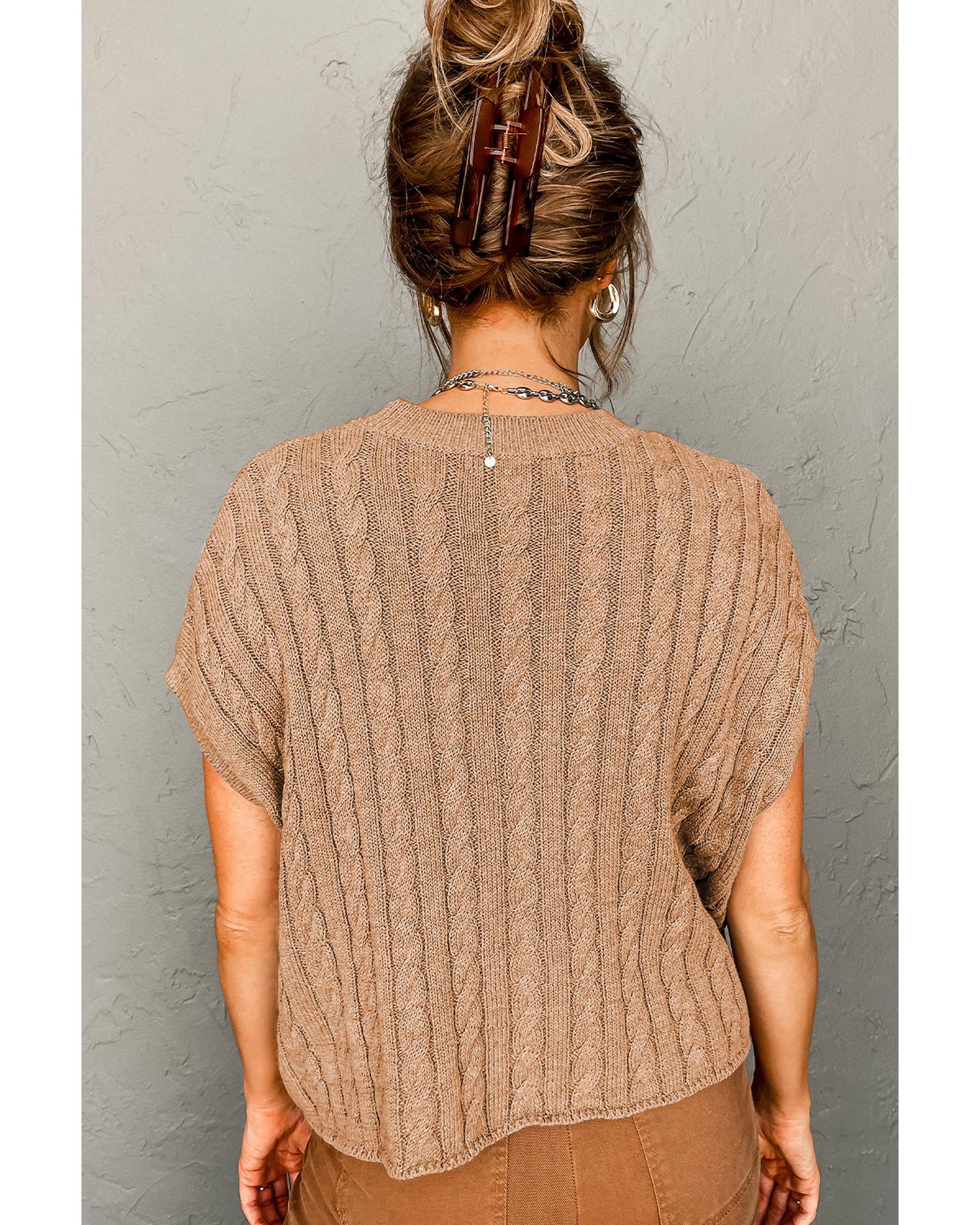 Light French Beige Crew Neck Cable Knit Short Sleeve Sweater – M