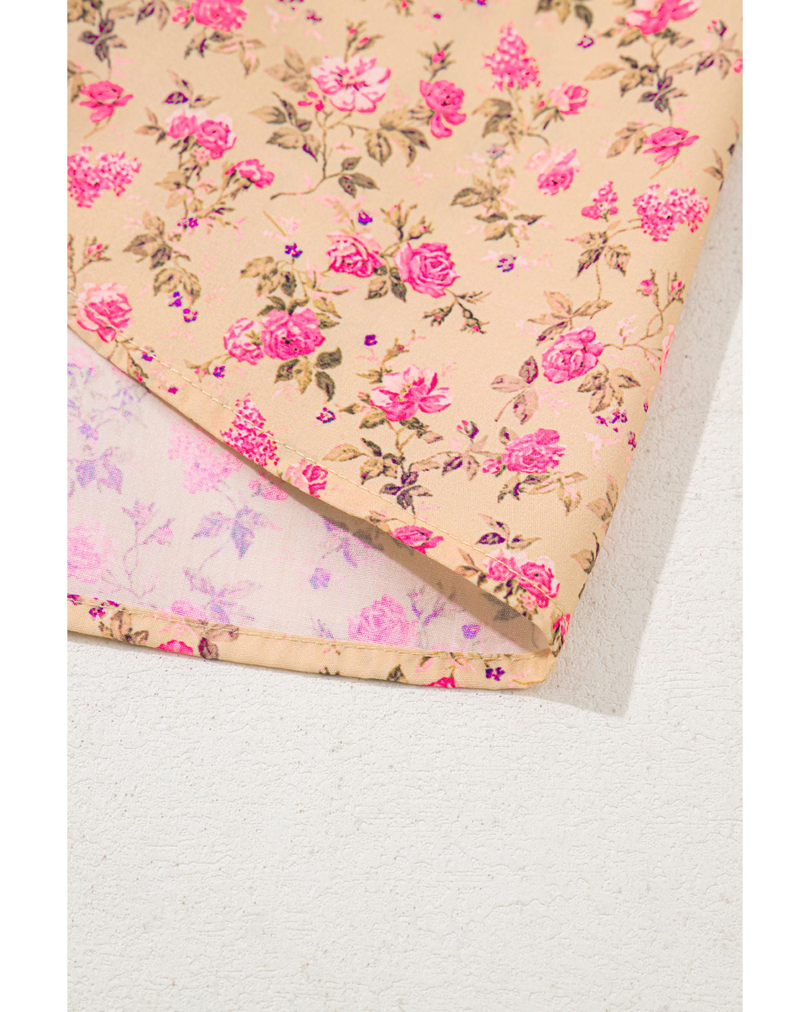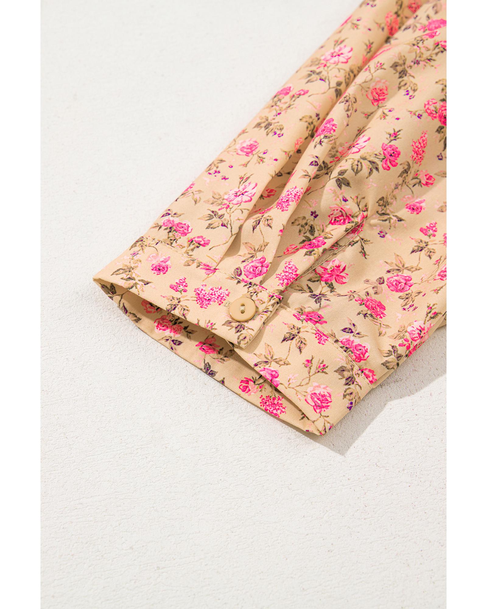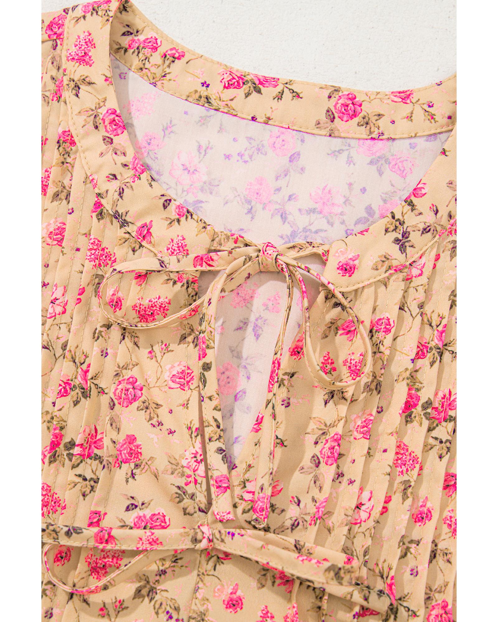 Light French Beige Floral Print Bow Pintuck Bust Half Puff Sleeve Blouse Top – M