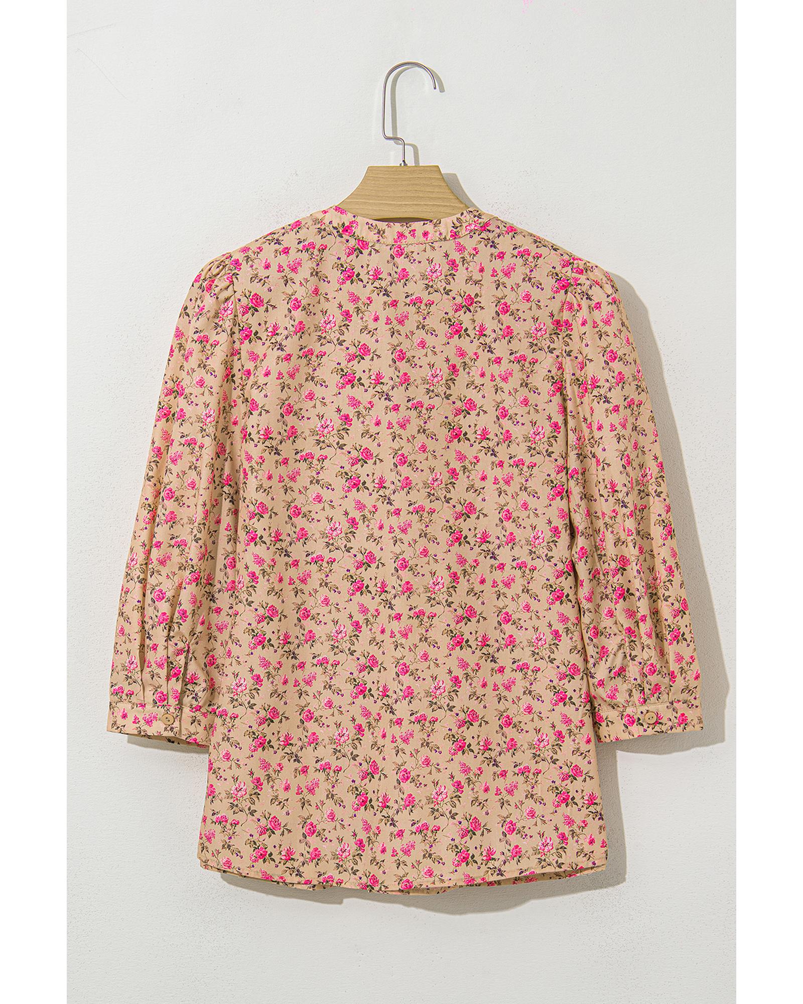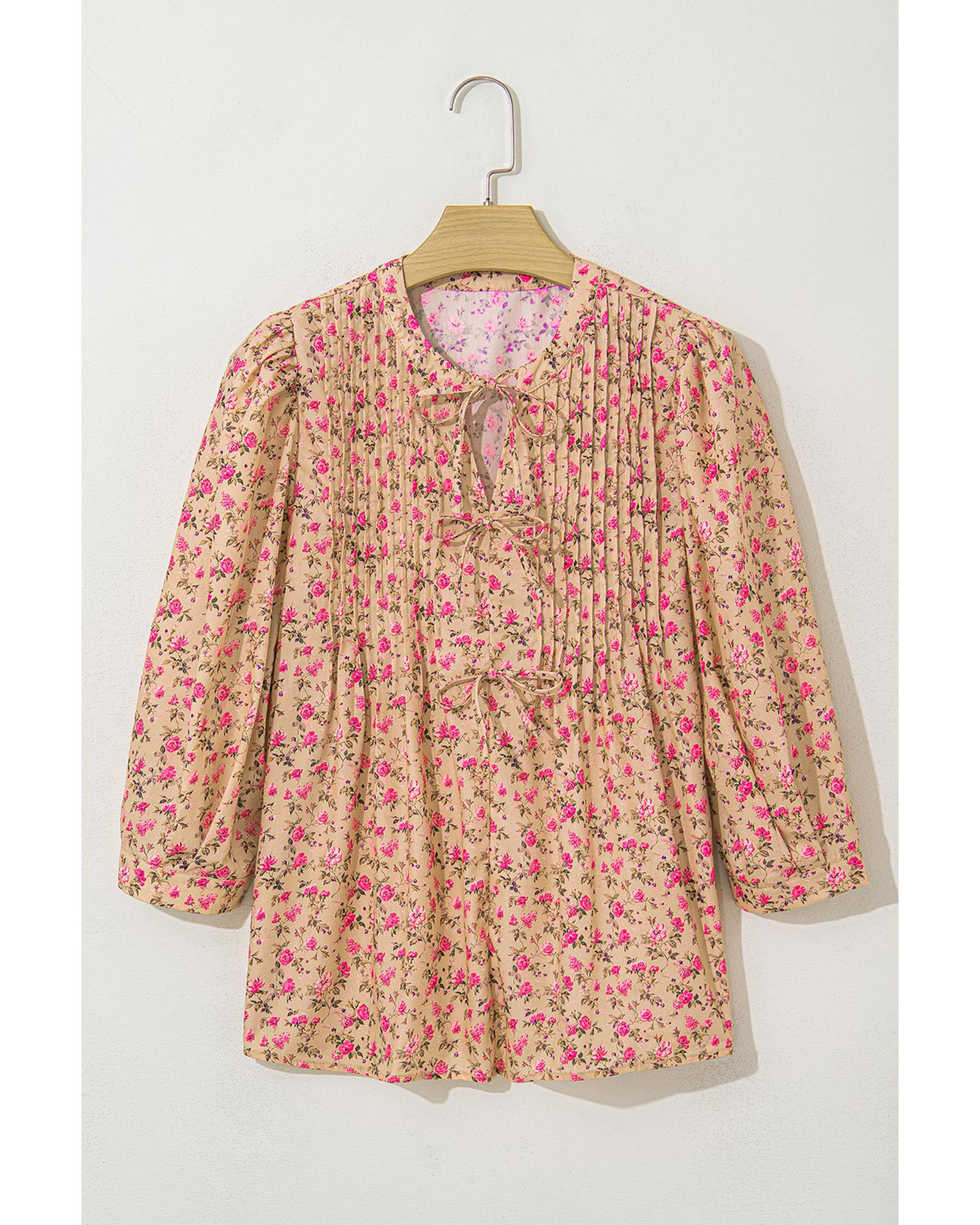 Light French Beige Floral Print Bow Pintuck Bust Half Puff Sleeve Blouse Top – S