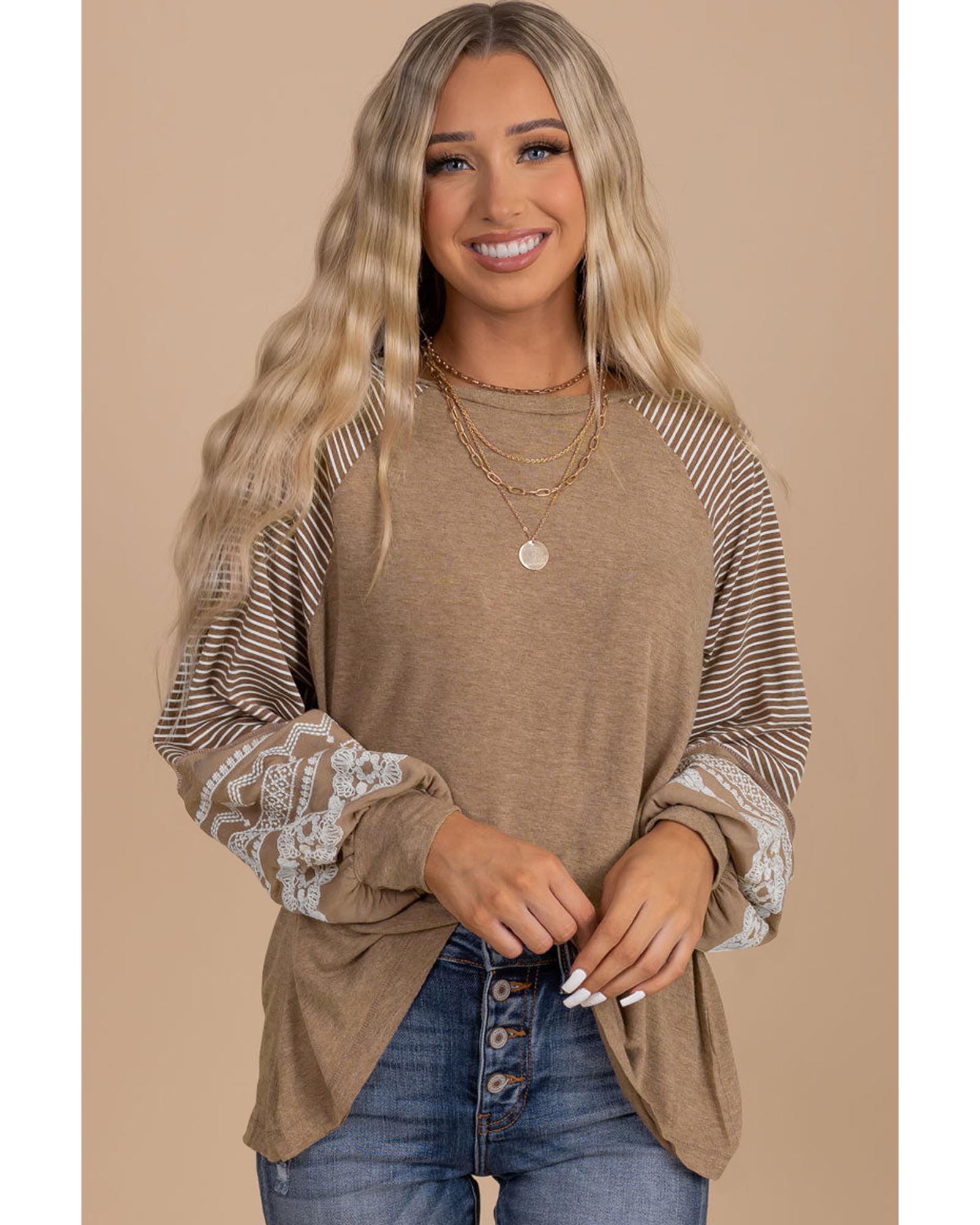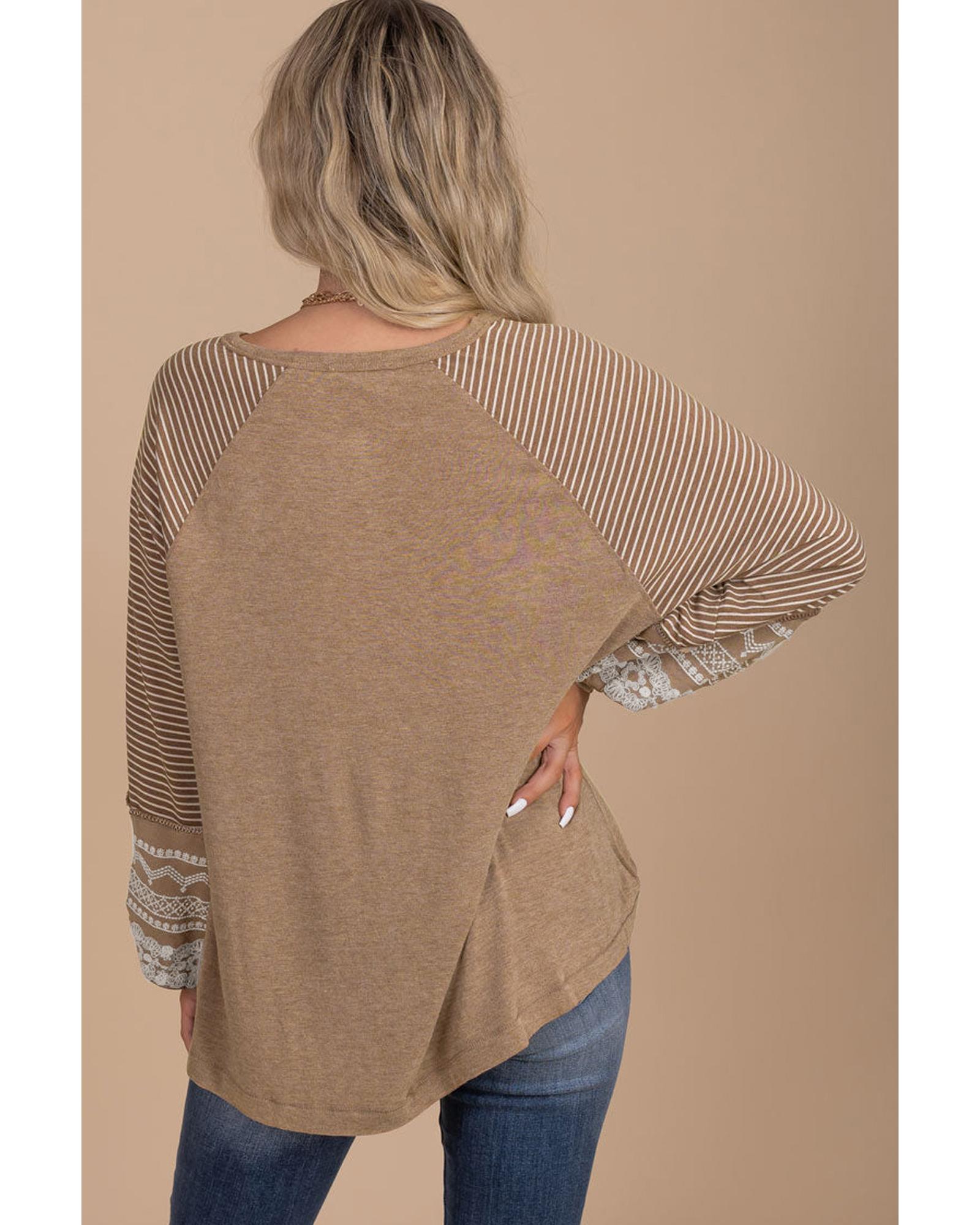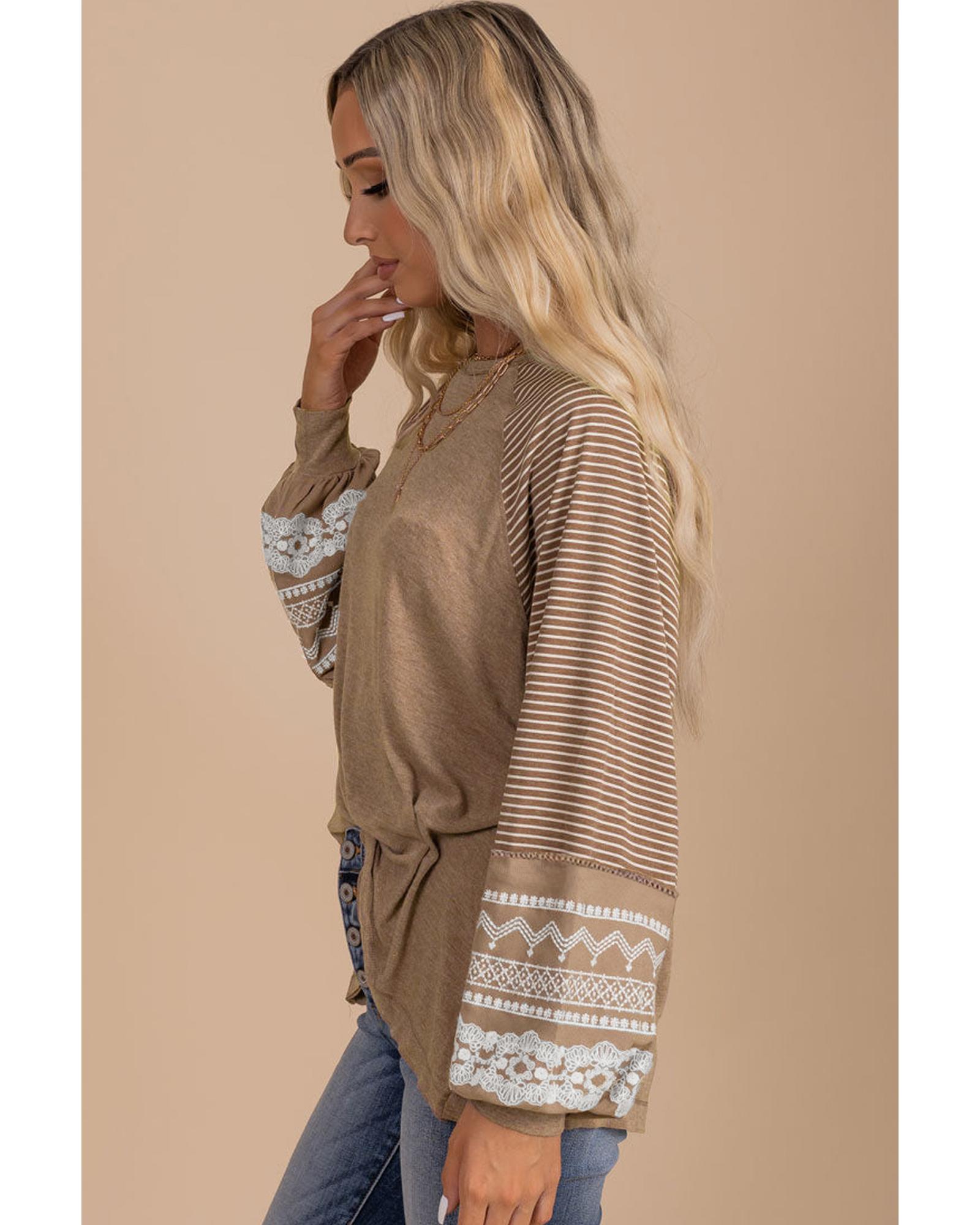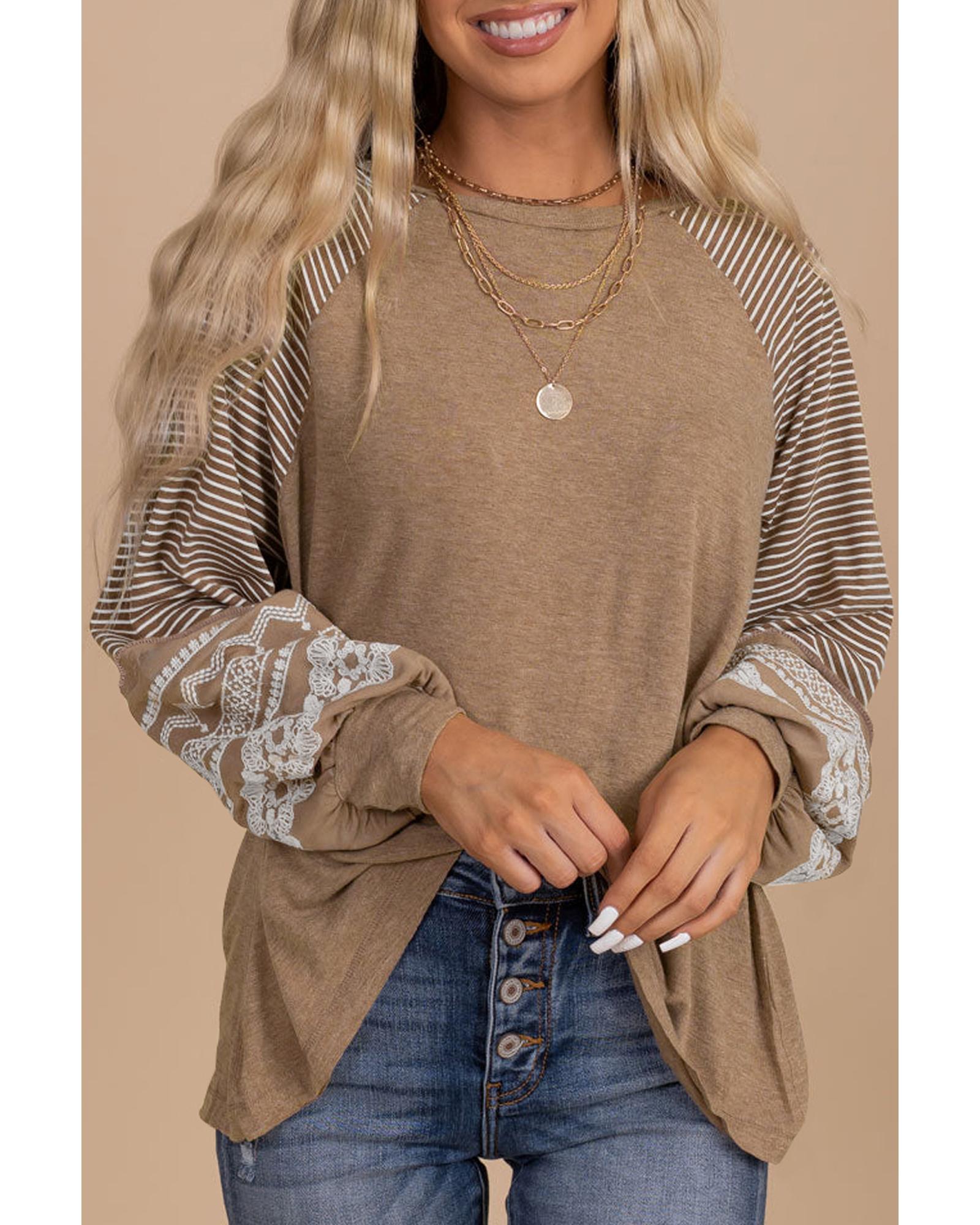 • Light French Beige Floral Striped Patchwork Loose Long Sleeve Top