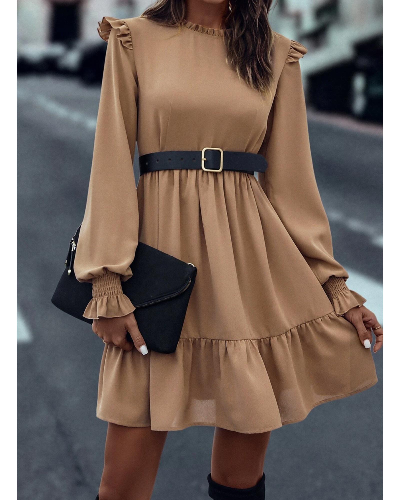 Light French Beige Frilled Collar Ruffled Shoulder Tiered Dress – S