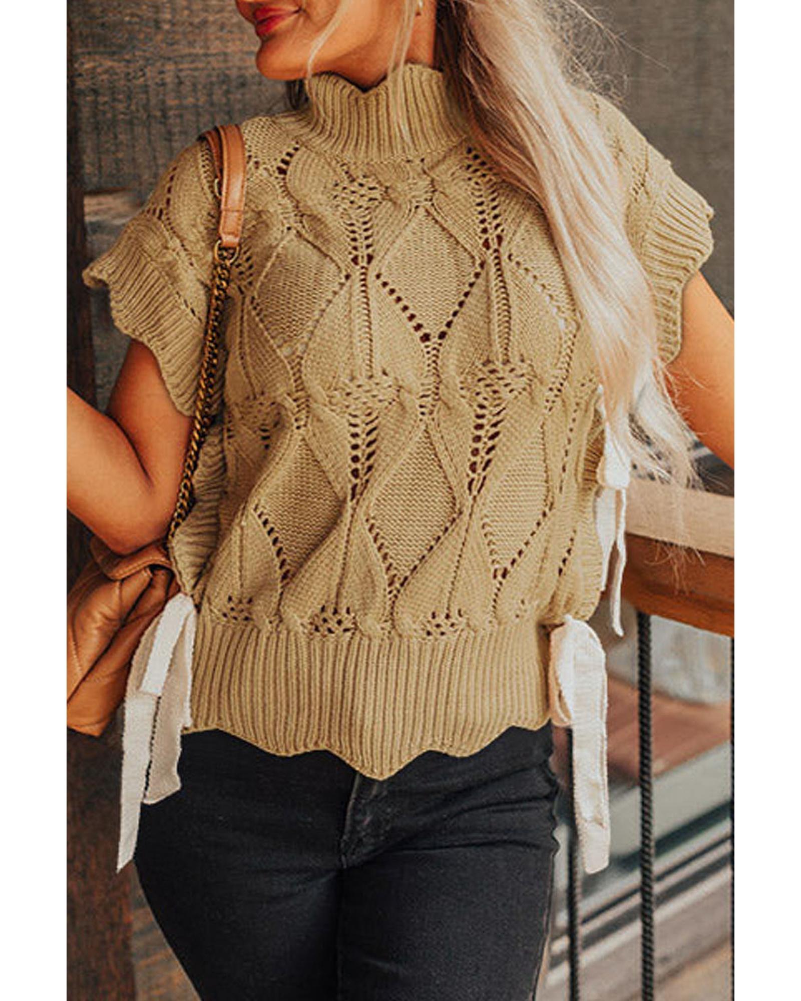 Light French Beige Hollowed Knit Scalloped Trim High Neck Sweater – L
