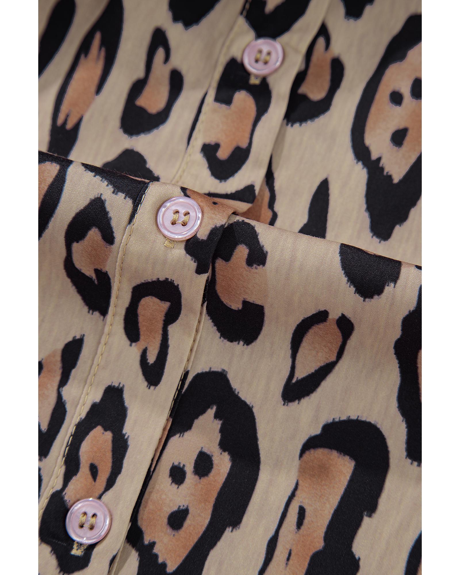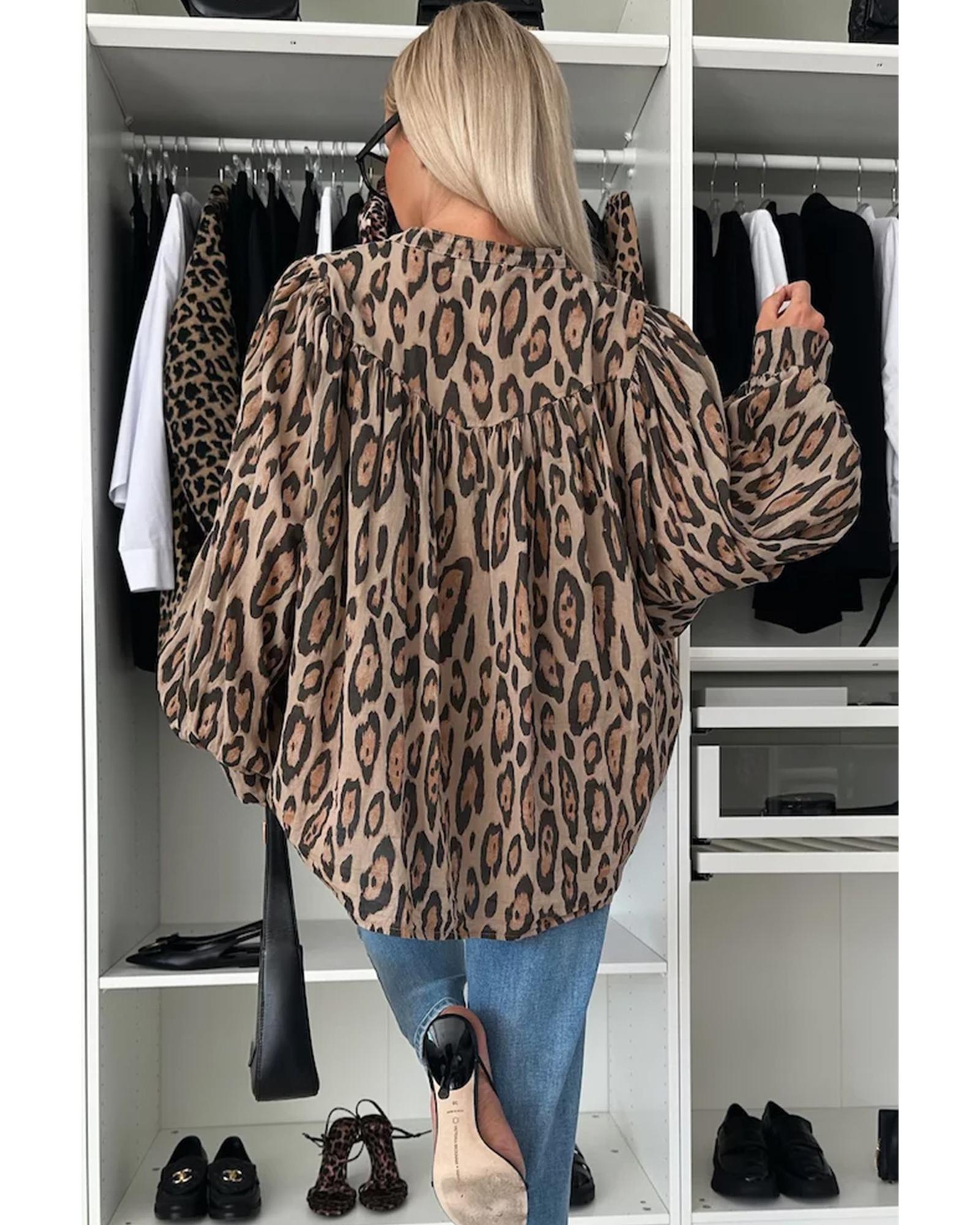 Light French Beige Oversized Leopard Print Balloon Sleeve Casual Shirt – S