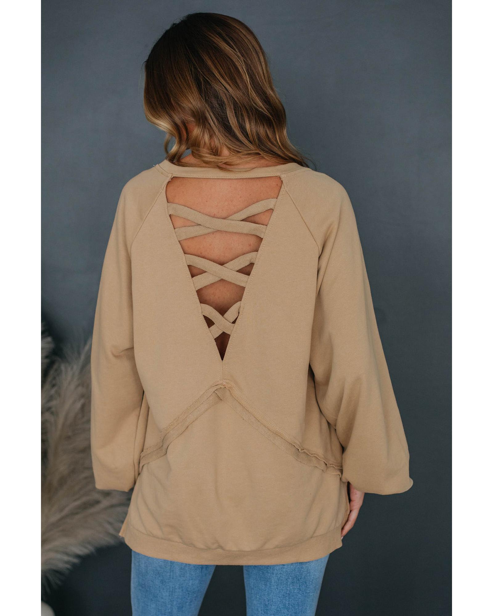 Light French Beige Solid Color Lattice Hollow Out Back Sweatshirt – S