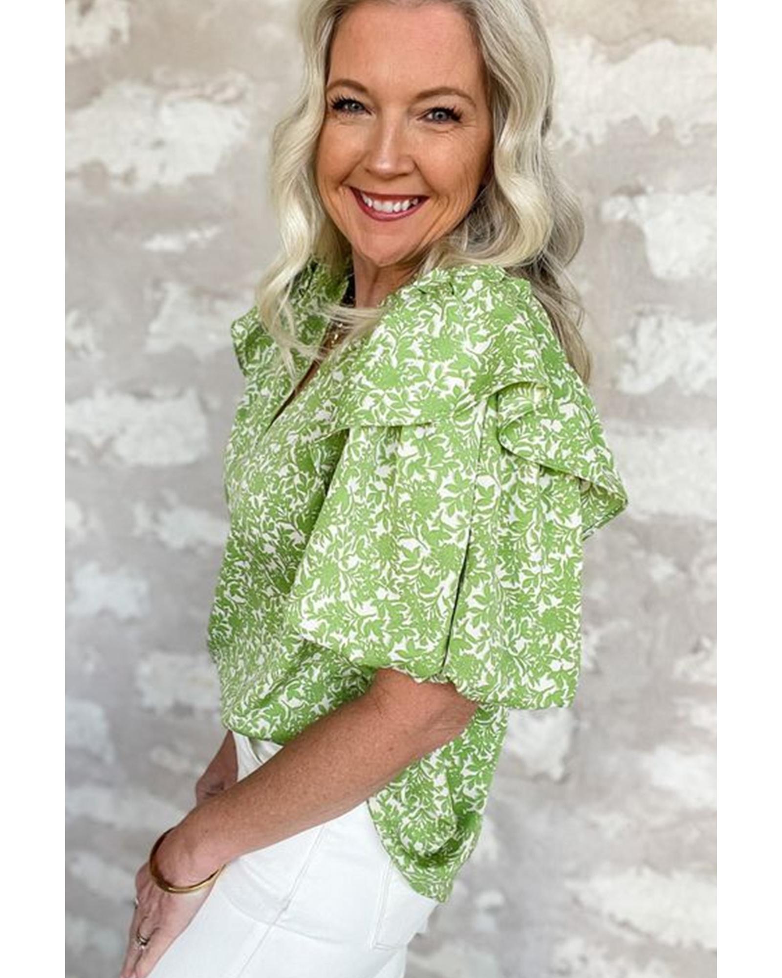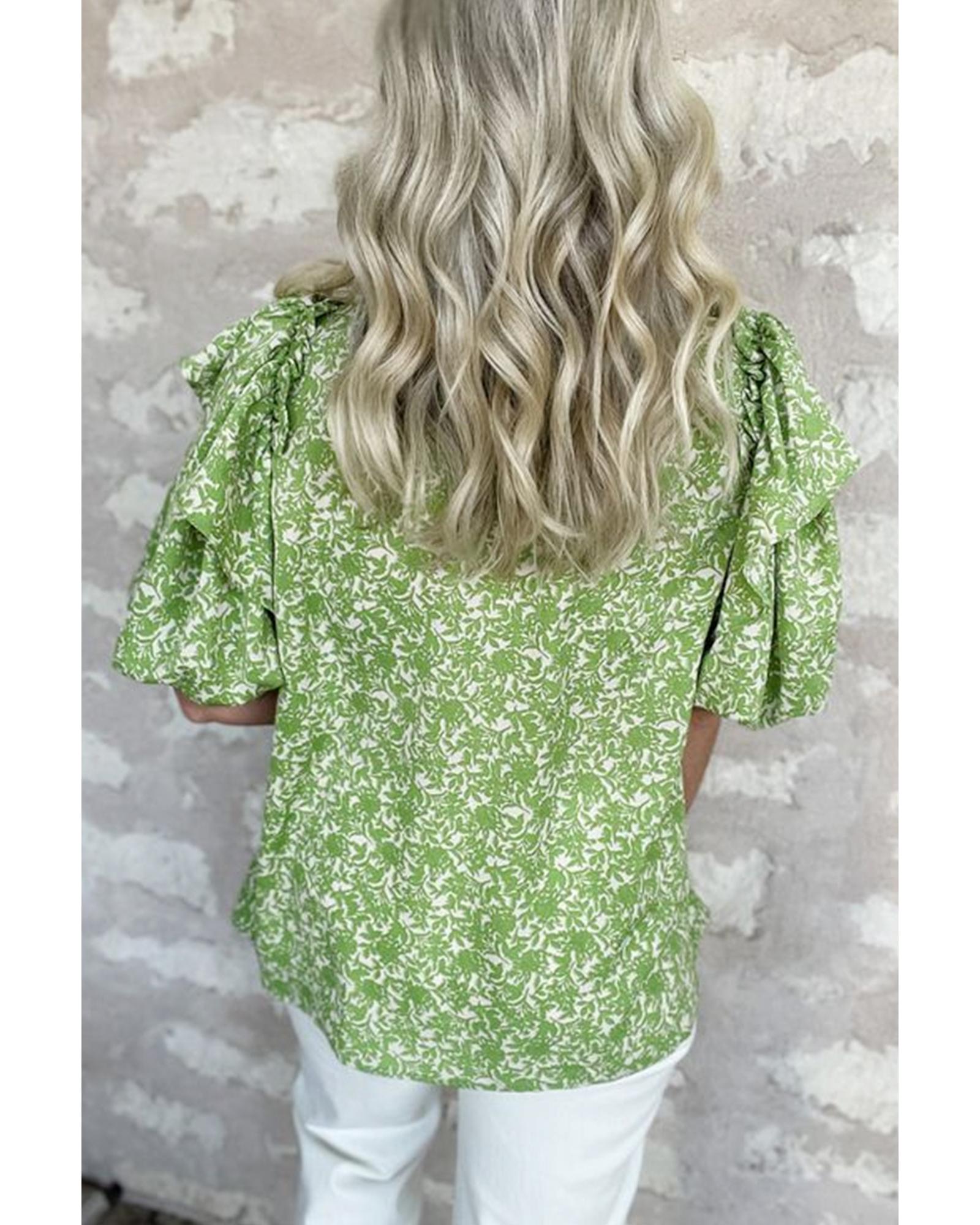 Light Green Floral Ruffle Puff Short Sleeve Frilled Collar V Neck Blouse – L