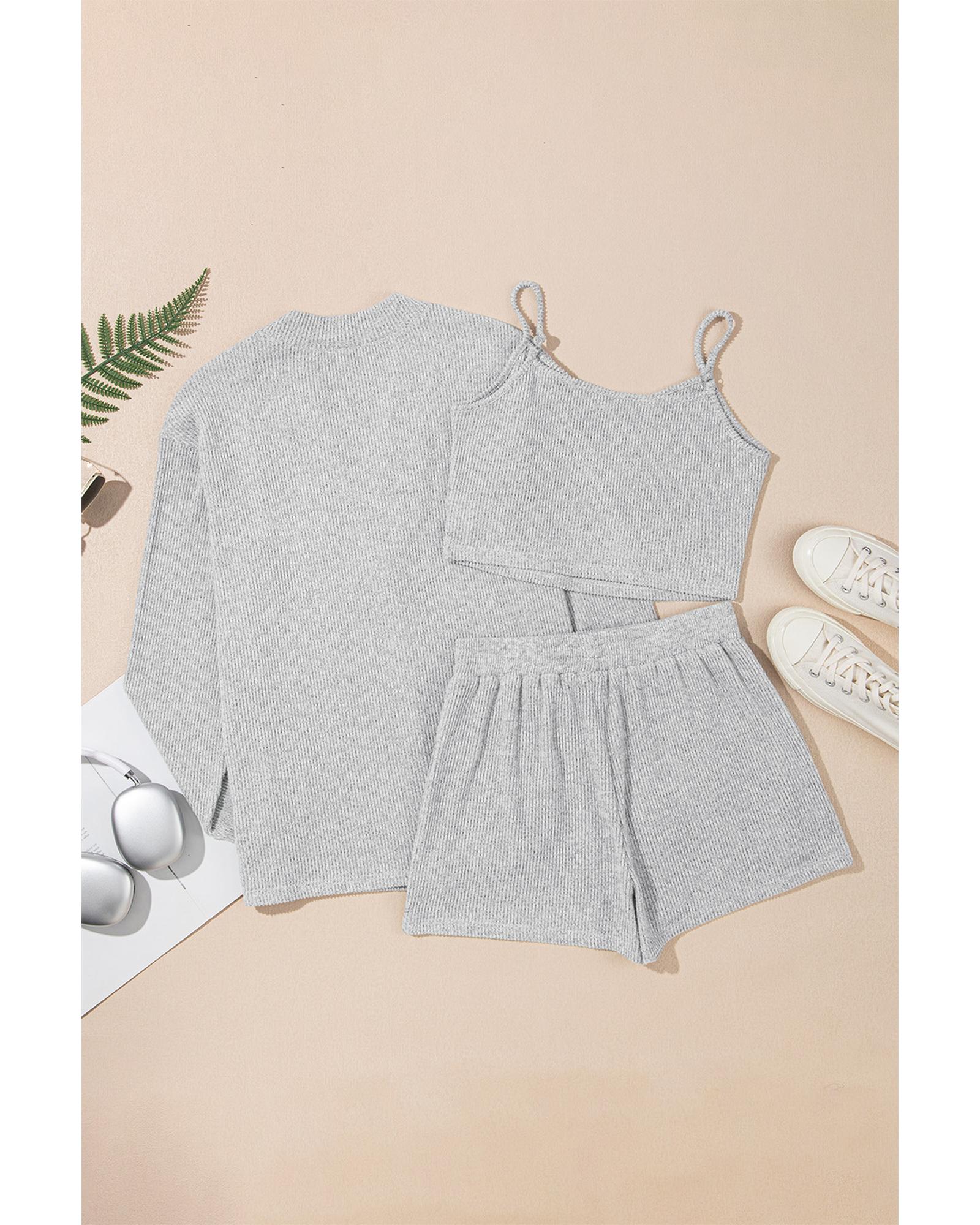 Light Grey 3 Pieces Rib Crop Camisole Matching Shorts Lounge Set with Cardigan – XL