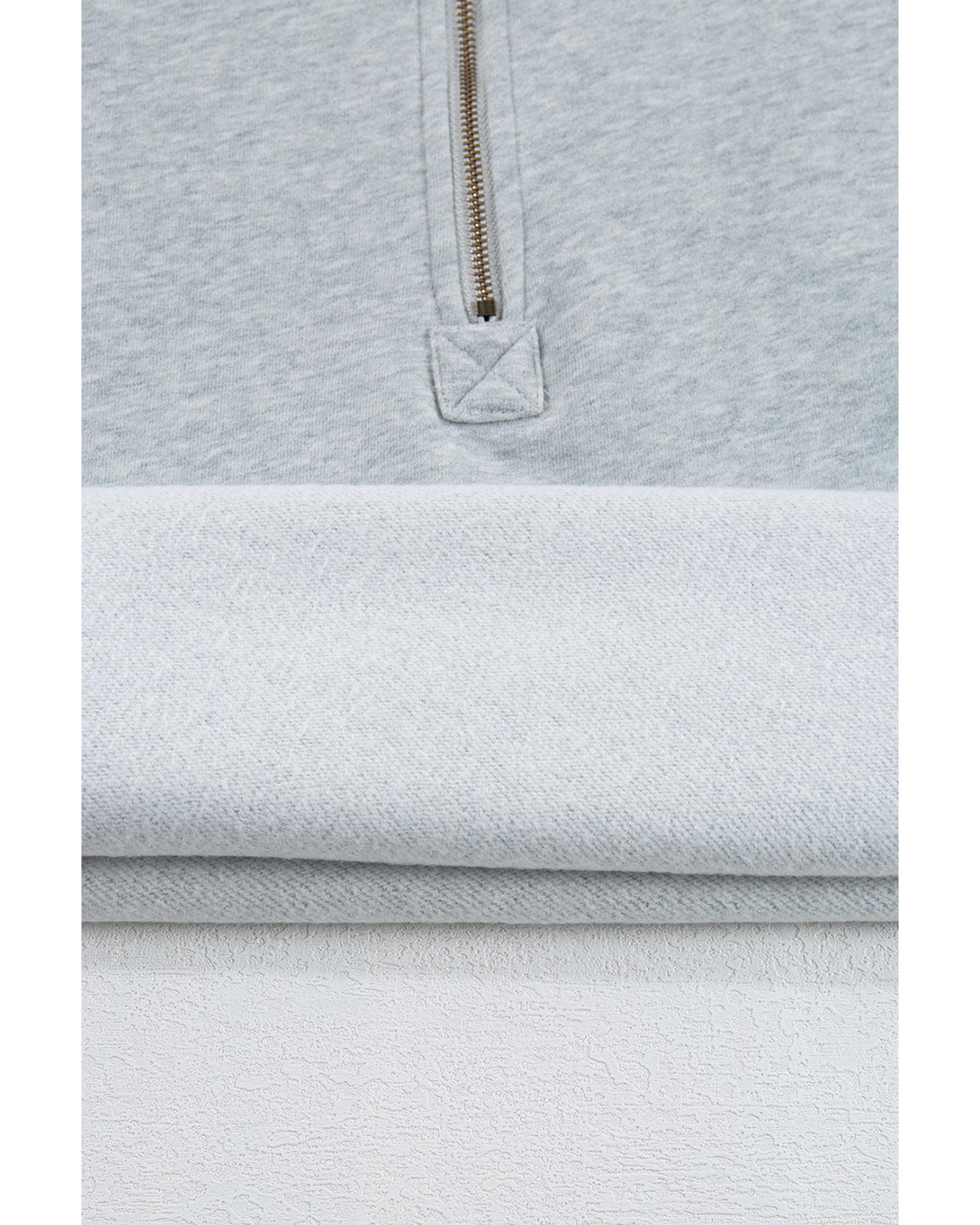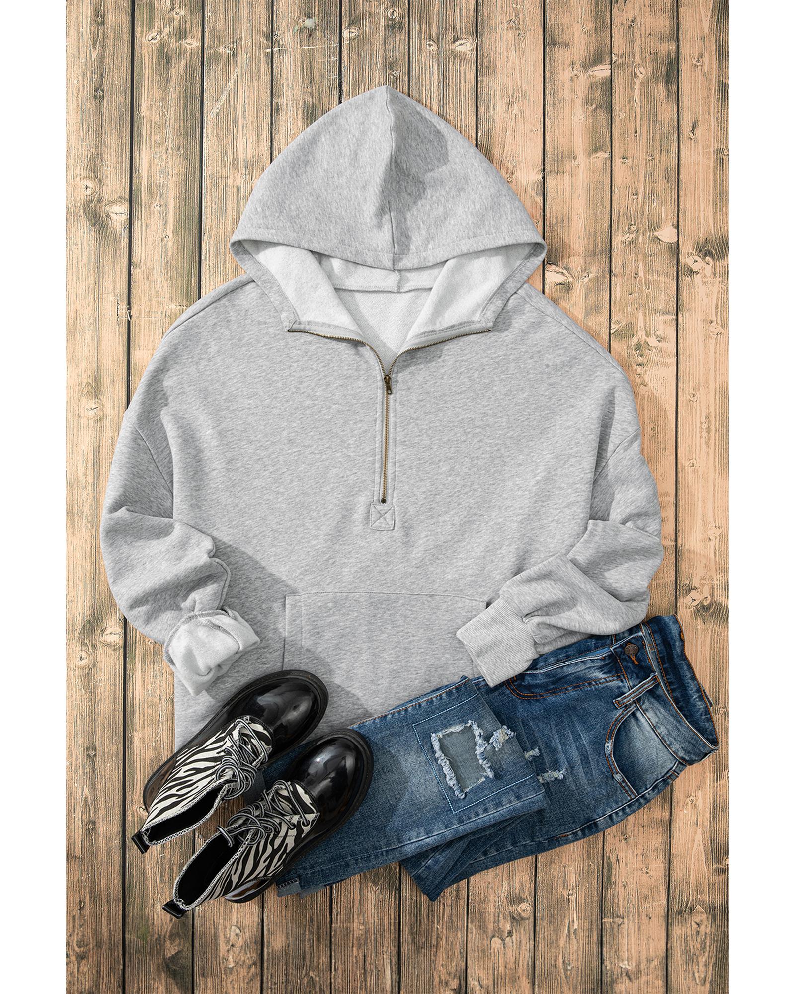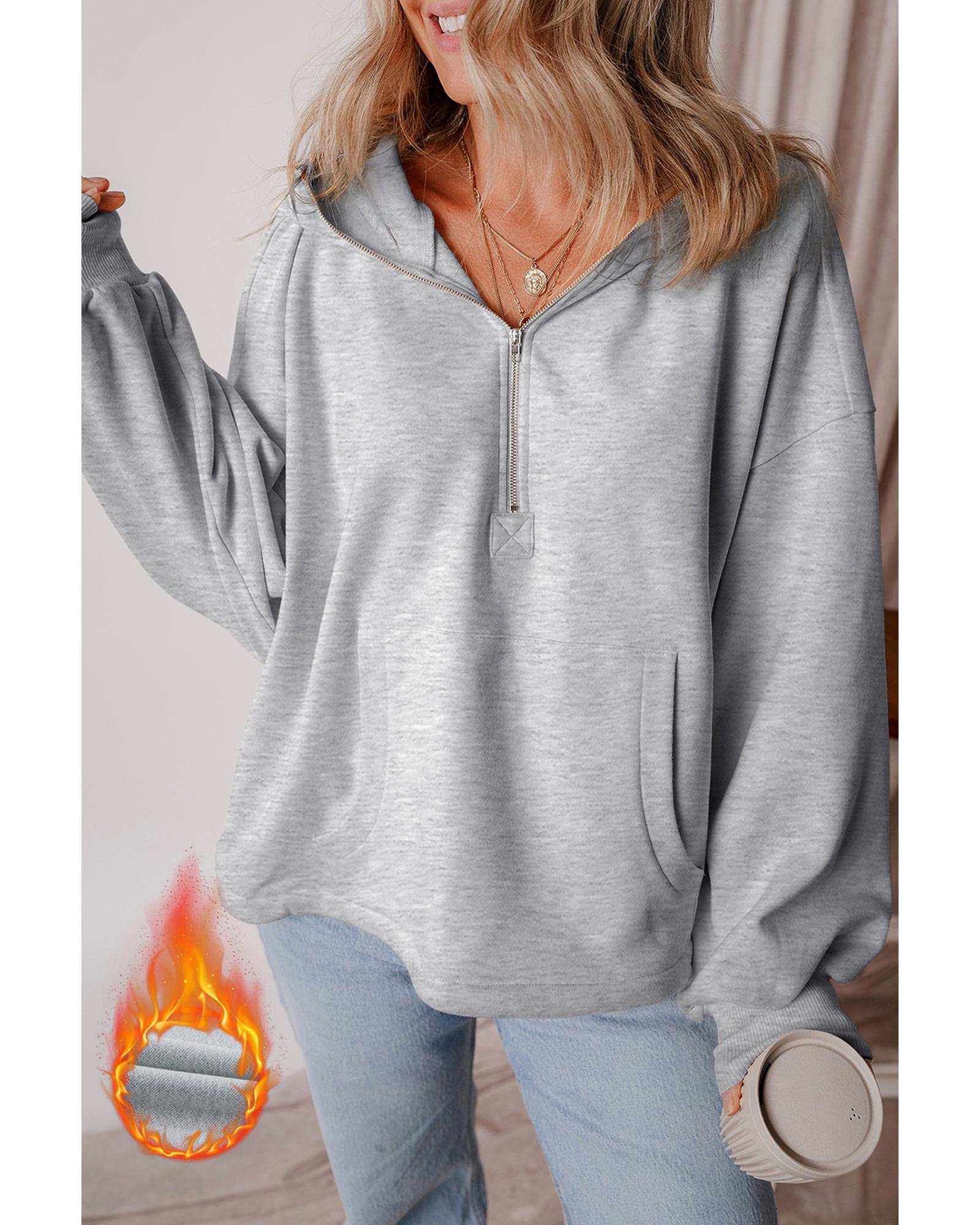 Light Grey Fleece Lined Half Zipper Kangaroo Pockets Loose Hoodie – M