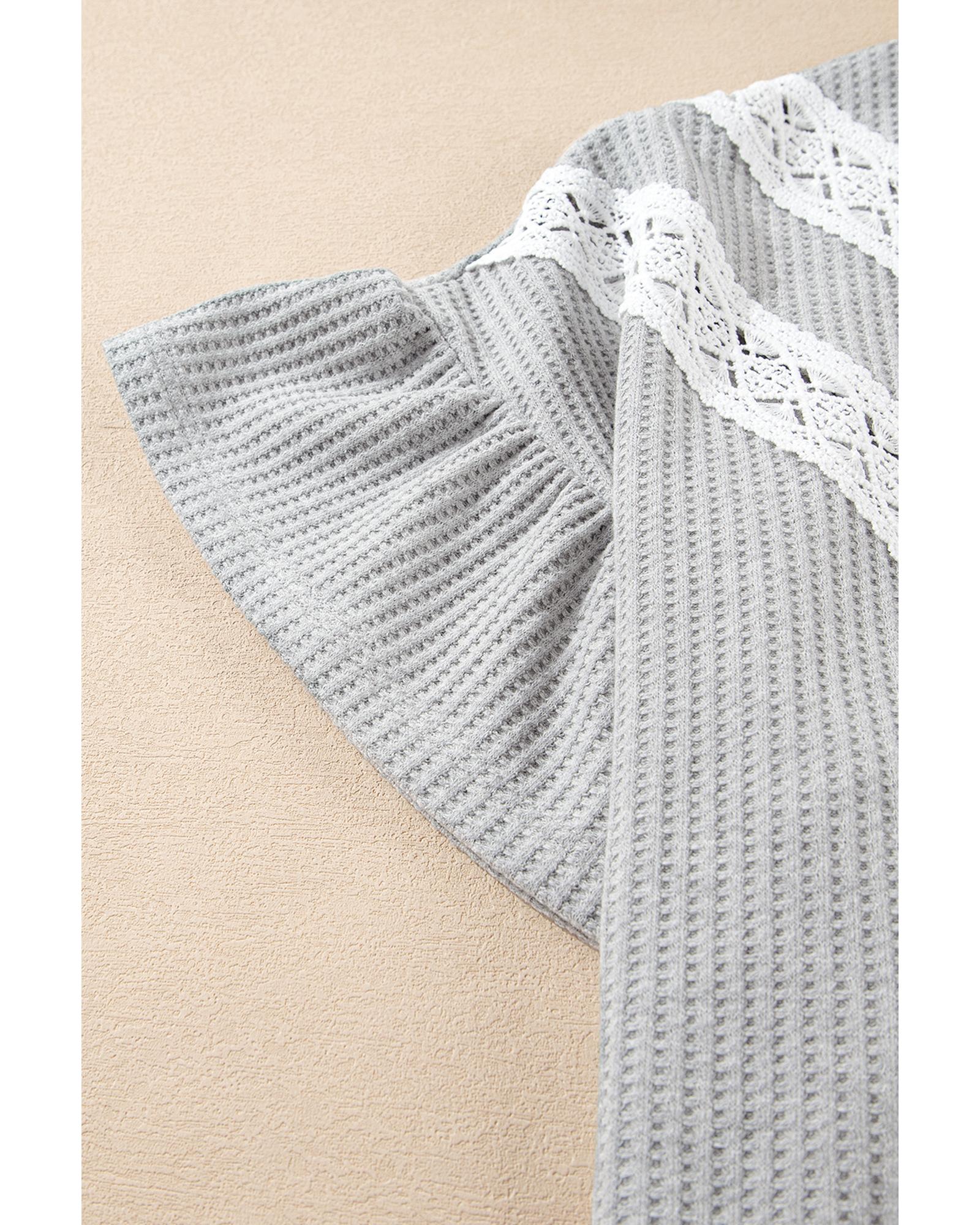 Light Grey Lace Insert Waffle Ruffle Short Sleeve Plus Size Top – 3X